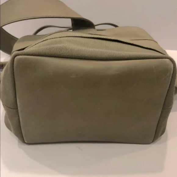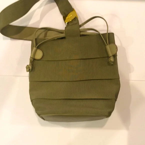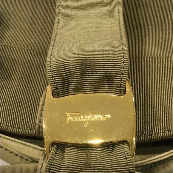 Salvatore Ferragamo Vintage Tiered Grosgrain and Leather Shoulder Bucket Bag - Style Number: AG214236 - Very Good ConditionExterior:> Beautifully Designedand Oh So Chic> Four Tiers of Ribbed Grosgrain Ribbon> Single Shoulder Strap in Grosgrain - Reverse Side Leather Backing with Signed Gold Metal Ferragamo Buckle> Color: Moss/Celery- Green> TopLeatherDrawstring - Opening/ ClosureInterior:> Black Supple Leather> Salvatore Ferragamo Leather LabelStyle Number: AG214236> Back Zipper Pocket with an AttachedGold > Ferragamo Signed Charm> Approximate Measurements:Strap Length: 38.5" InchesHeight: 9"InchesWidth: 10" InchesBottom Base: 5" x 6.5" Inches> Superb Quality and Craftsmanship> Spacious in Size to carry all your on the go Essentials> Made in Italy> Leather Bottom -Has Slight Surface Wear which is typical with a Bag that has No Metal Resting Feet.Refer To Pictures
