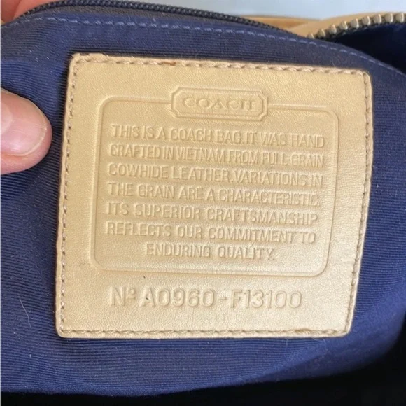 Authentic soft leather Coach Leather Logo Embossed Gallery Tote with Coach logo embossed on front slippocket for easy access. Butter cream colored leatherand stitching is smooth to the touch. Silver hardwareaccents. Full zip top protects navy blue interior withkey ring, 2 slip pockets, pen pocket & zipper pocketfor organization. Silver feet on the bottom of thebag, protects the leather. Clean interior. Double,adjustable shoulder straps for a comfortable fit underyour arm. Approximate measurements - 13" x 12" x 4”Getting at the bottom Adjustable strap drop 8-10" Photos are part of thedescription, zoom to see detailed condition All questions are welcomed Thank you for stopping by Erica