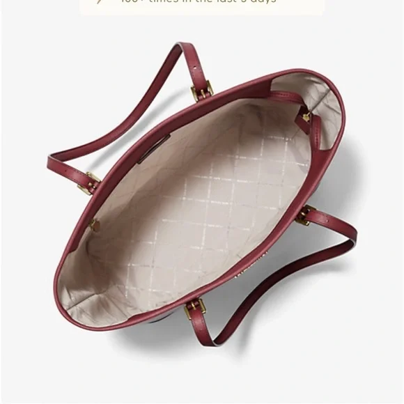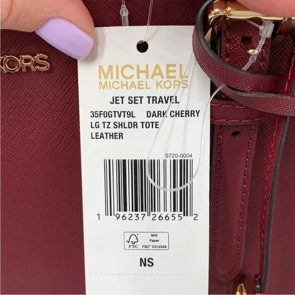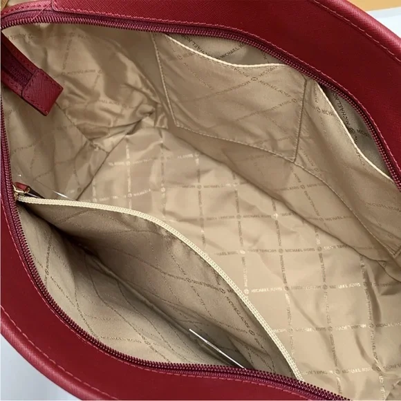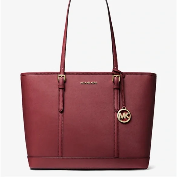 MICHAEL KORSJet Set Travel Large Saffiano Leather Tote Shoulder BagCOLOR DARK CHERRYNWTNew with the tag authenticJet Set Travel tote is a timeless style for every season.Crafted from Saffiano leather accented with a topstitch trim, it opens to a spacious interior with plenty of room to store all your essentials-be it for a day or for an entire weekend. Use the inside slip pocket to stow small items that require easy access.• Tote bag• Saffiano leather• 100% leather from tanneries meeting the highest standards of environmental performance• Gold-tone hardware• 17"W X 11.5"H X 6.25" D• Handle drop: 11"• Interior details: back zip pocket, 2 front slip pockets• Lining: 100% polyester• Zip fastening• Dust bag not included• Imported• Style # 35FOGTVT9L