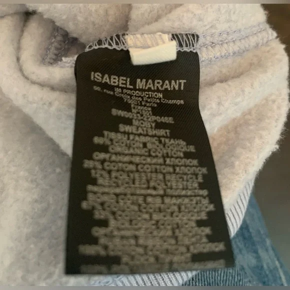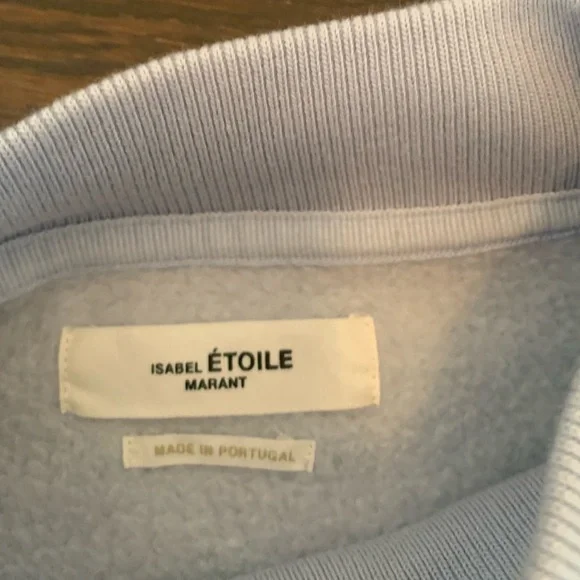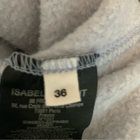 Women’s pale blue sweatshirt featuring a bold purple Isabel Marant logo. Purchased in Paris at Galleries Lafayette. Size 36/small.