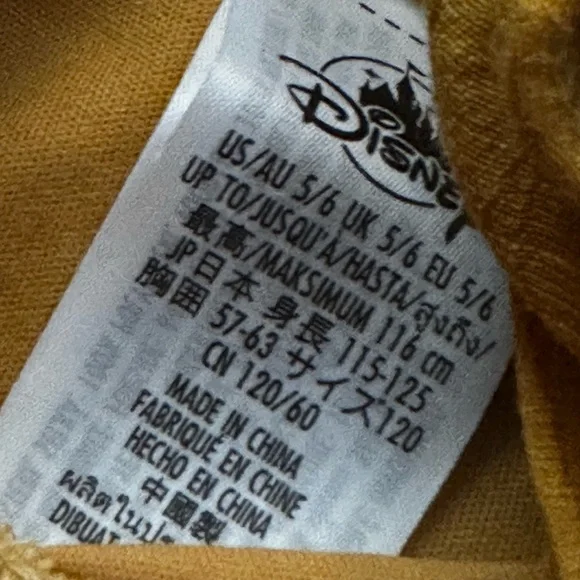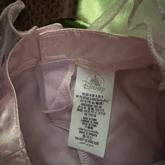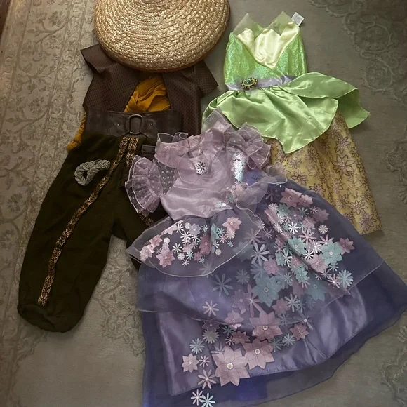 Costumes from Disney World and the Disney store online and one from target. PLEASE READ ABOUT SIZES Includes Raya, Tiana, and Encanto outfits with Raya had and accessories.Size range is 4/5 & 5/6 & 4T but my daugh wore them all while in a size 4/5 and now she is in a 6/7 they no longer fit. Hopefully that helps you when deciding to buy. They are well taken care of items however the Raya one is well loved it has a stains on the shirt and pant that are from her painting in it liter the first time she wore it. The hat tip is worn. See photos. But it is quality material.Comes with Raya shoes