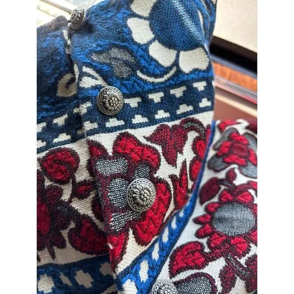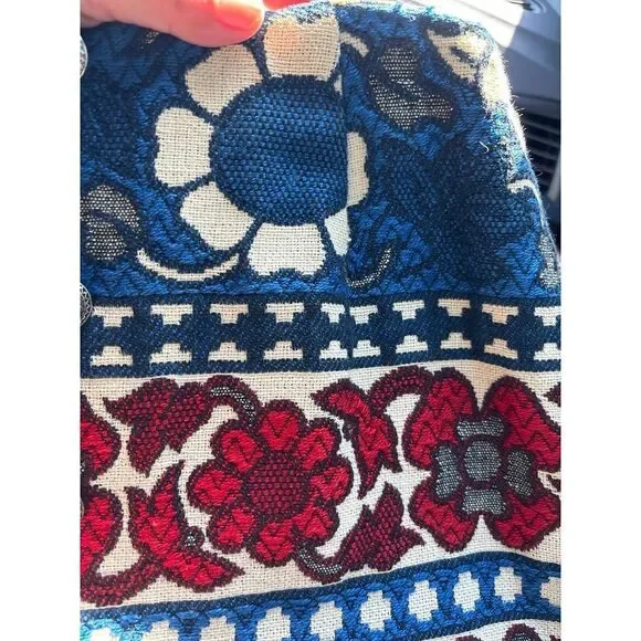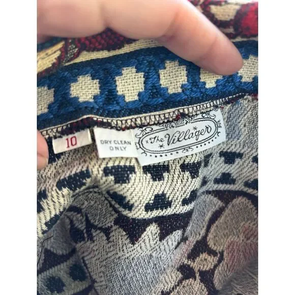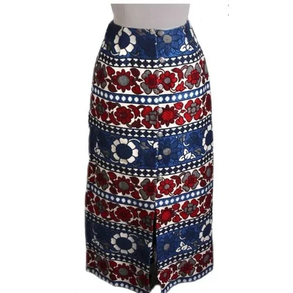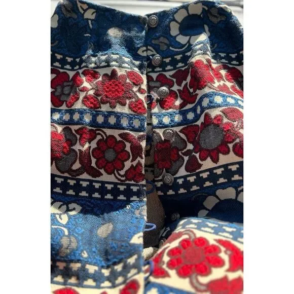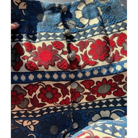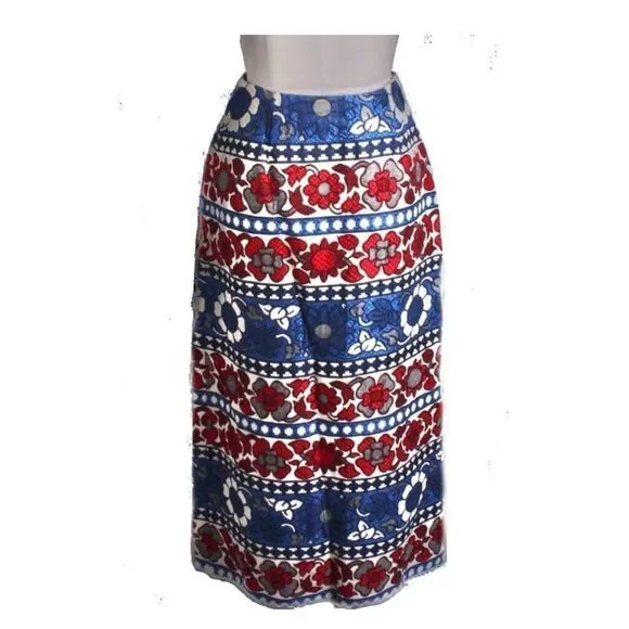 Vintage Villager Maxi Skirt Cotton Brocade Red White Blue Floral Bold Women S 10 1970s, with antique sunflower silver button /loop front closure, size 10In great condition!CottonUnlinedCan be styled western, boho chic, or cottage core!!!Pictured beautifully!Please see measurements for perfect fit!Vintage clothing is made smaller.Measurements: laid flatWaist: 13''Hips:20"Length :35"