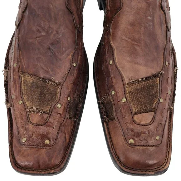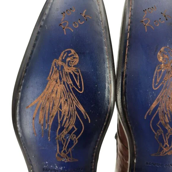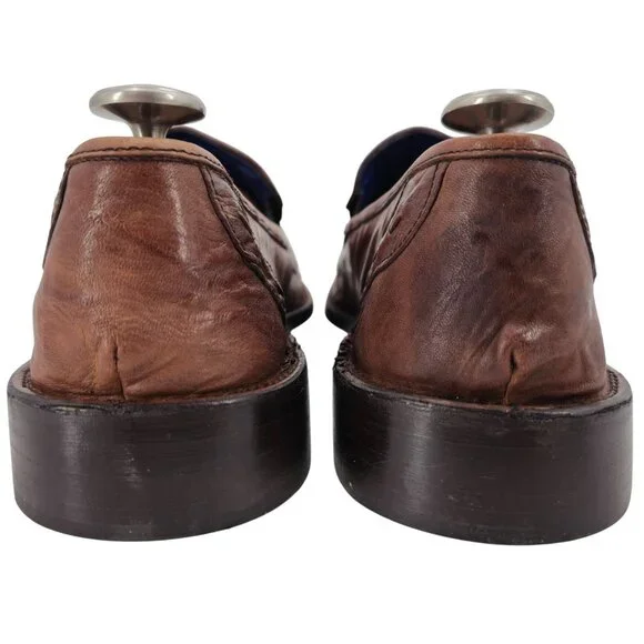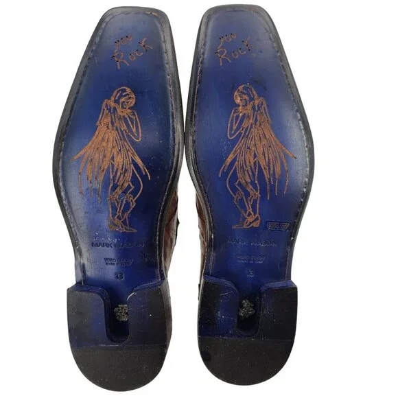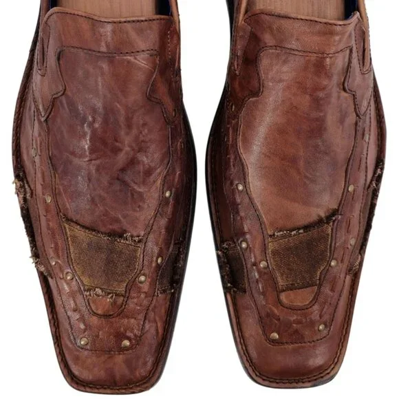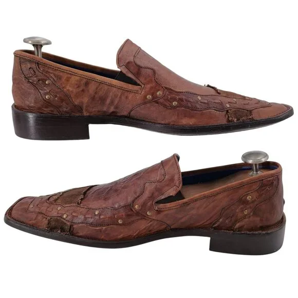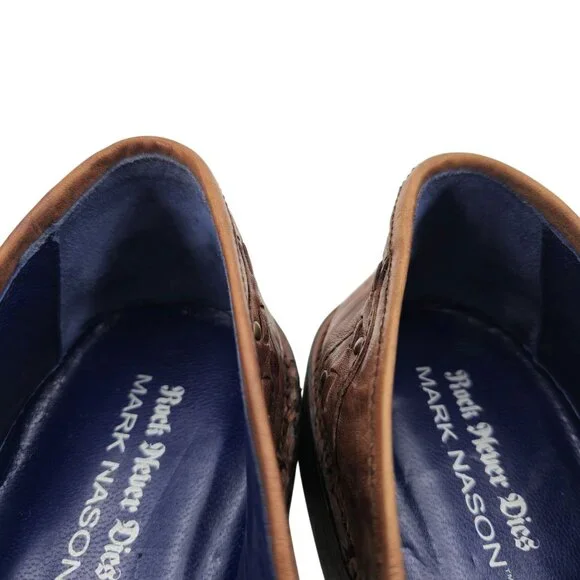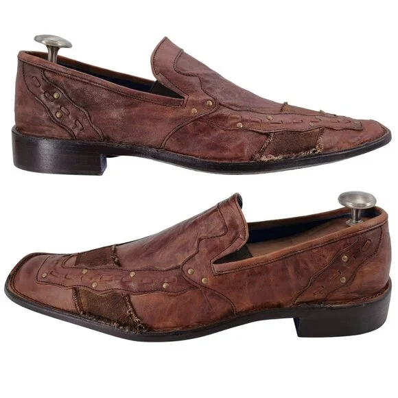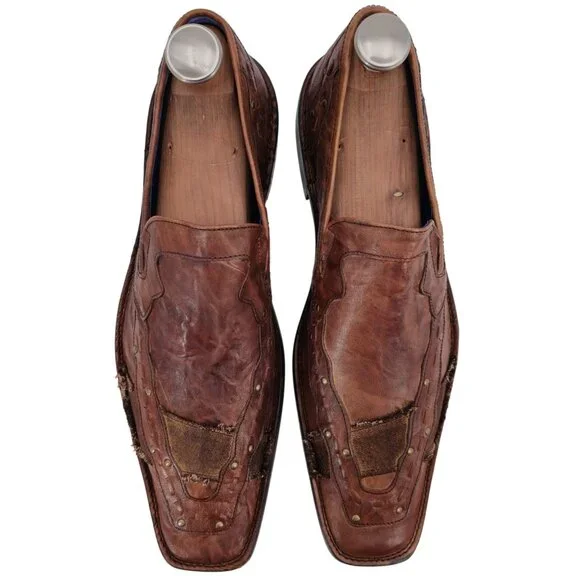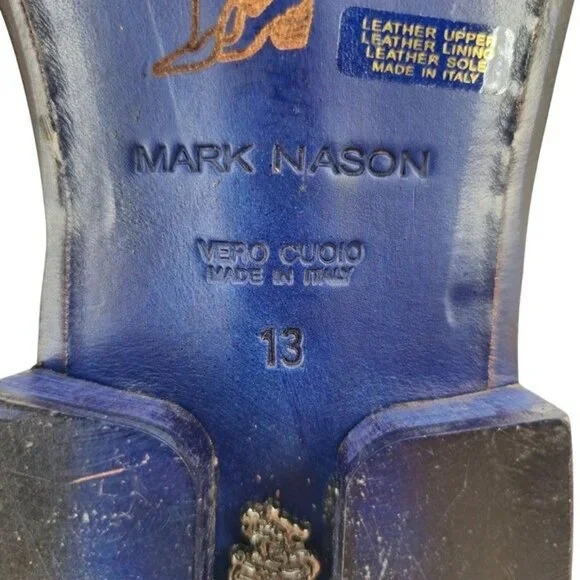 #84NEWMark NasonRock Lives CollectionModel: 67362Distressed Patchwork Leather LoafersCrafted In ItalyColor: Distressed Brown US Men's size:13Bottom Sole Measurements (approx.)Heel to Toe:13.5 inWidest Spot:4.5 inInsole foot bed length:12.5 in==Honest Condition Report==Appears new without box, may have light wear from handling/try-onsUppers:10/10Linings:10/10Outsoles:10/10 An iconic piece from the Mark Nason “Rock Never Dies” lineup, fuses Italian quality with a distinctly rock-and-roll aesthetic. Distressed brown leather, square toes, and patchwork details with brass studs create a look that’s bold yet versatile. Perfect for collectors—or anyone ready to make a subtle statement.Trusted Seller with near perfect feedback!Shoe trees and other props are for display only unless otherwise mentioned in item description/title