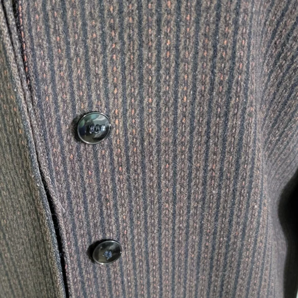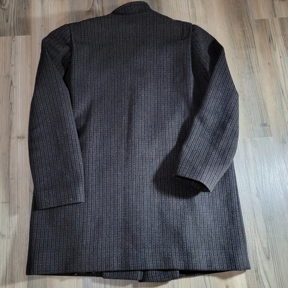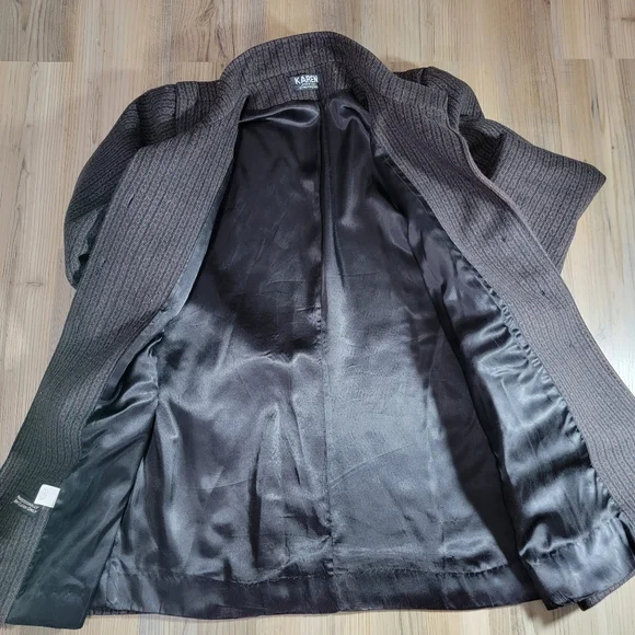 This vintage women's coat from the USA is a classic addition to any wardrobe. Made from a luxurious blend of wool, polyester, and cashmere, it features a pleated design with a button closure and a collared neckline. The coat is lined with polyester and has a single-breasted cut with pockets. It is a size large, although please see the measurements for an accurate fit. Perfect for winter, this long coat has a striped pattern in multicolor and is perfect for travel, casual outings, or business meetings. The coat is dry clean only and has a regular fit. It is a Karen brand coat with a timeless theme and is perfect for those who appreciate a classic style.