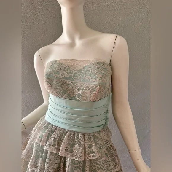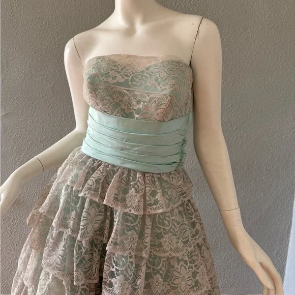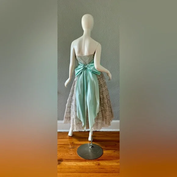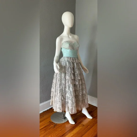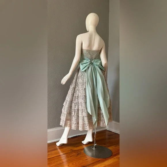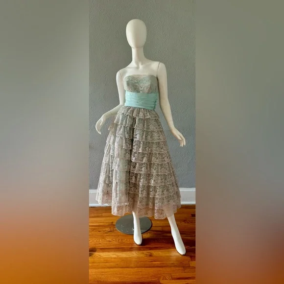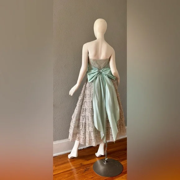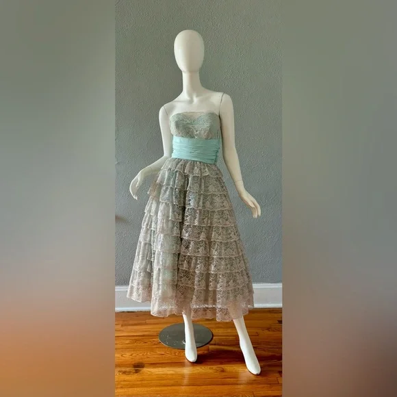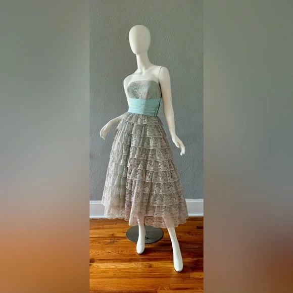 V I N T A G E 1950s. fully lined. empire waistline. metal side zipper. strapless, sweetheart neckline. cummerbund waist with beautiful aqua sash. huge bow in back. tea length. tulle lining skirt; 3 layers!. tiered, scallop laceC O L O R S. gray | blueM A T E R I A L. acetate blendL A B E L. hand createdC O N D I T I O N. excellentS I Z E. tag size // n-a. recommended size // xsM E A S U R E M E N T S (garment not stretched). chest // 34. waist // 25. hips // 50. length // 48** all items were measured laid flat & measurements for chest, waist, & hips have already been doubled **