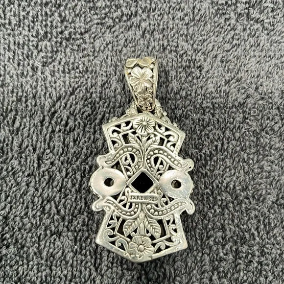 Sarda is luxury designer jewelry made by hand in Bali and designed by Janyl Sherman. All of Sarda’s genuine solid silver jewelry is hypoallergenic and nickel-free, made by expert artisans in Bali. Each piece undergoes a 6-step polishing and oxidation process, for a stunning dimensional effect that also prevents tarnish. The amethyst is a competition, bird’s nest cut! This is a large amethyst and a statement pendant!Retired!See my listing for the matching ring!Brand, Seller, or Collection Name:SARDAMetal stamp0.925Metal:Sterling SilverMaterial:Metal, gemstoneGem Type: Amethyst (1), Mystic Topaz (2)Minimum total gem weight:5.54 caratsSetting: BezelHeight without bale: 9 millimetersWidth:29 millimetersNumber of stones: 3Stone Weight: 4.90 carats, 0.32 carats