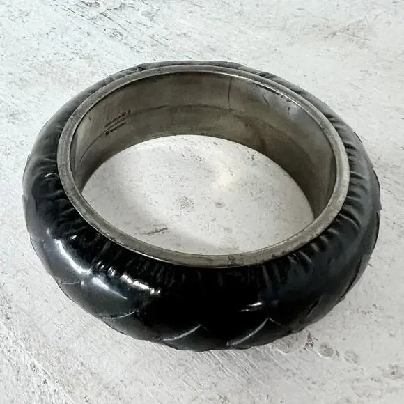 Bottega Veneta Sterling Silver Intrecciato Patent Leather Bangle BraceletMSRP: $750Item condition: gently worn very good condition, no flaws or heavy wear.diameter internal 2.5''Brand: Bottega Veneta Color: BlackIconic Intrecciato weavePolished sterling silver accentsSleek patent leather exterior The rich texture and high-shine finish make it a standout accessory that effortlessly elevates any outfit.bangle, fashion, luxury, accessories, accessory, jewelry, bracelet,casual, modern, trendy, designer, timeless, fashion statement, elegant, bracelet, bangle, leather5 star. seller - 5.000+ items sold - Fast shipping - Closets of influencers and fashion collectors-Shop with confidence - Smoke-free clean storage environment -Bundle and Save! - New arrivals every week