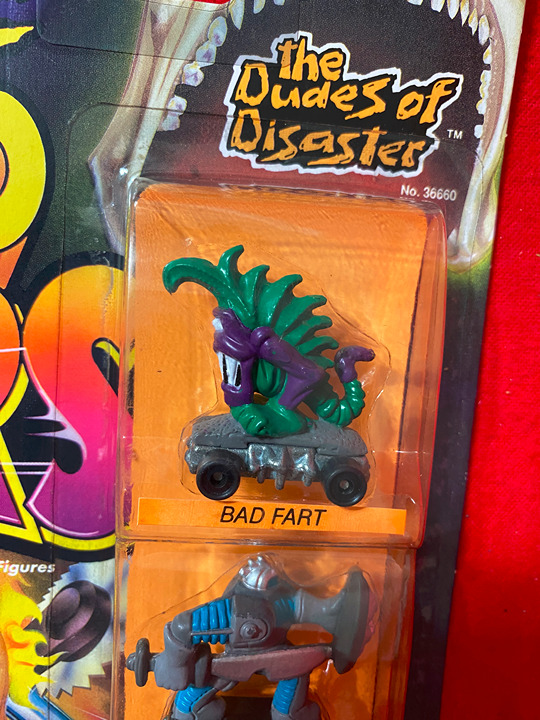This vintage 1991 Savage Mondo Blitzers set is called, "The Dudes of Disaster". It features 4 wheeled psychos (figures on skateboards): (1) Bad Fart, (2) Blade Invader, (3) Killer Kommando and (4) Twin Geeks. It is factory sealed on the original card and has never been opened. The card is in very good condition.