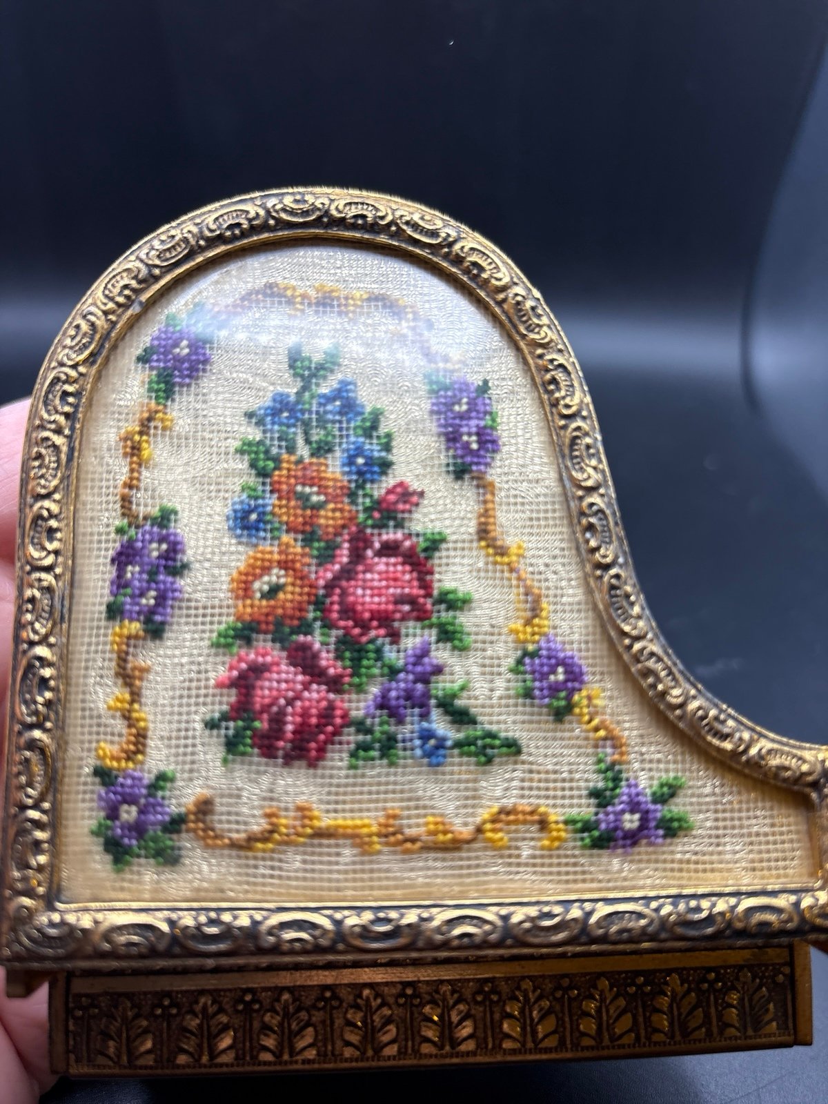 Beautiful Reuge Made in Austria piano music box that plays "The Blue Danube - it is made from a gold metal that resembles brass. The top of the piano is covered in delicate floral petit point needlepoint covered with a clear plastic cover - The bottom of the little piano is marked with "REUGE" and "Made in Austria." Wind the music box on the bottom and then lift the lid to the keyboard and the music box begins playing. Shut the lid and the music stops.