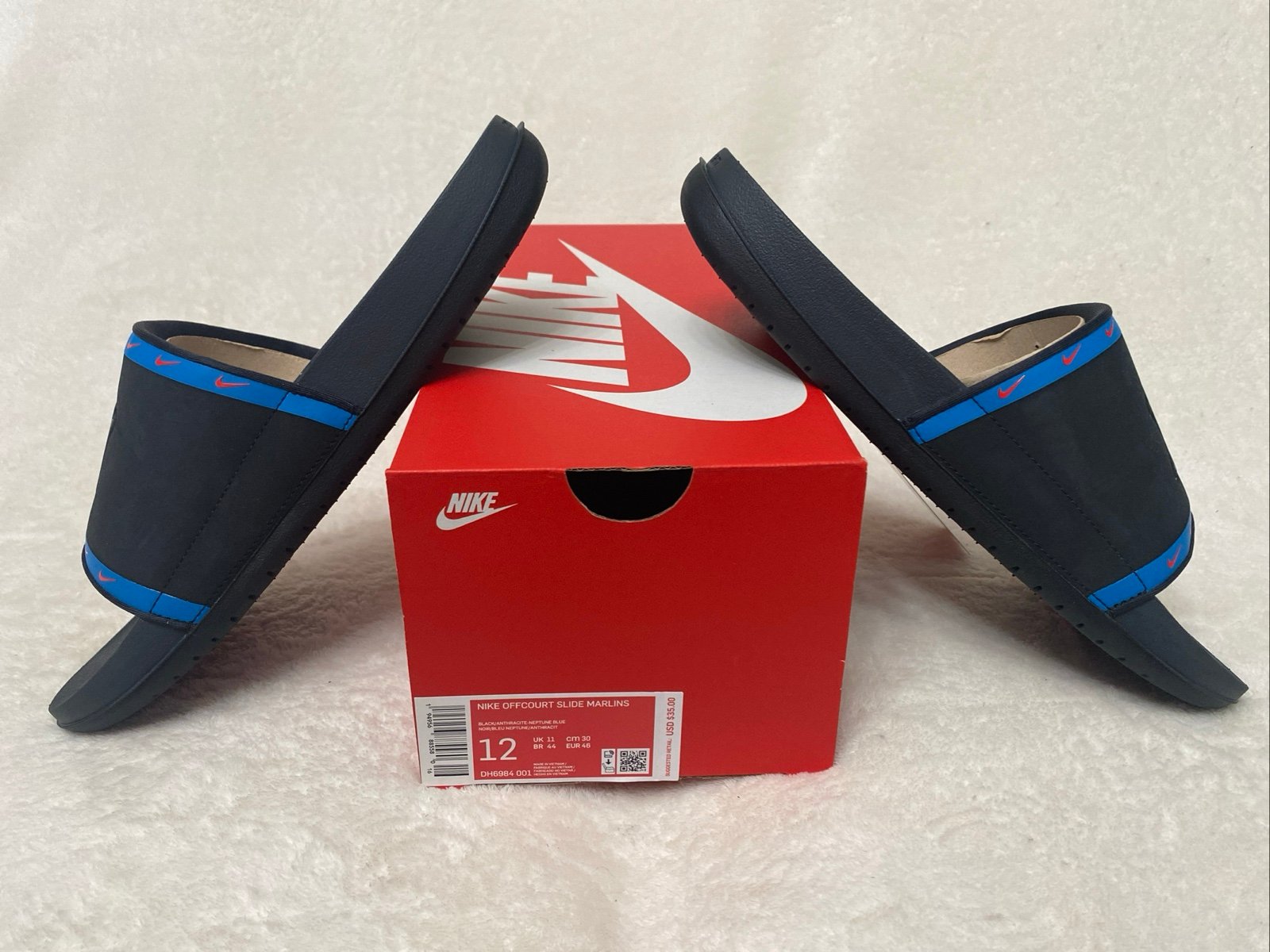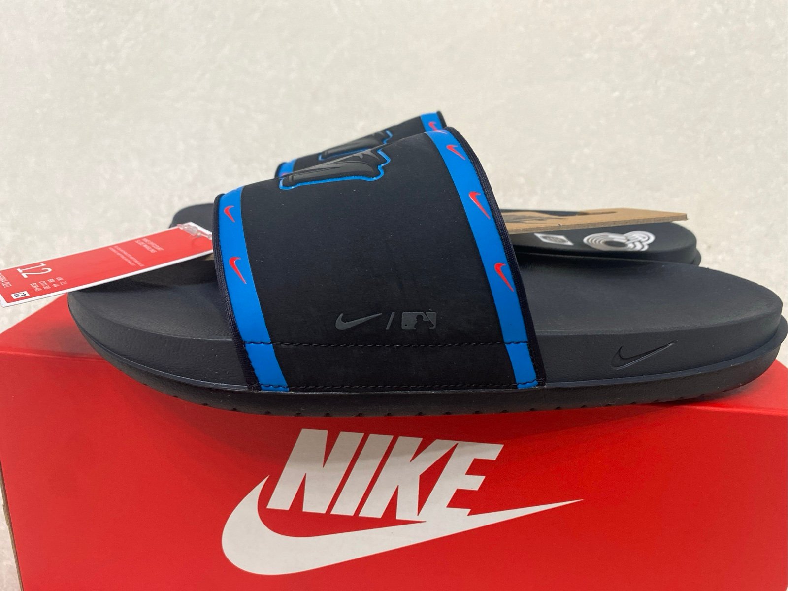 Love To Wear These After getting Off The Court/field!!! The product is a pair of Nike slides in size 12 specifically designed for men. These black sandals are part of the Florida Marlins collection, featuring a comfortable design suitable for postgame wear. Made with synthetic upper material, these slides are perfect for casual outings or lounging in style. With the Nike brand and comfortable features, these slides offer both style and comfort for men seeking a reliable and stylish footwear option.