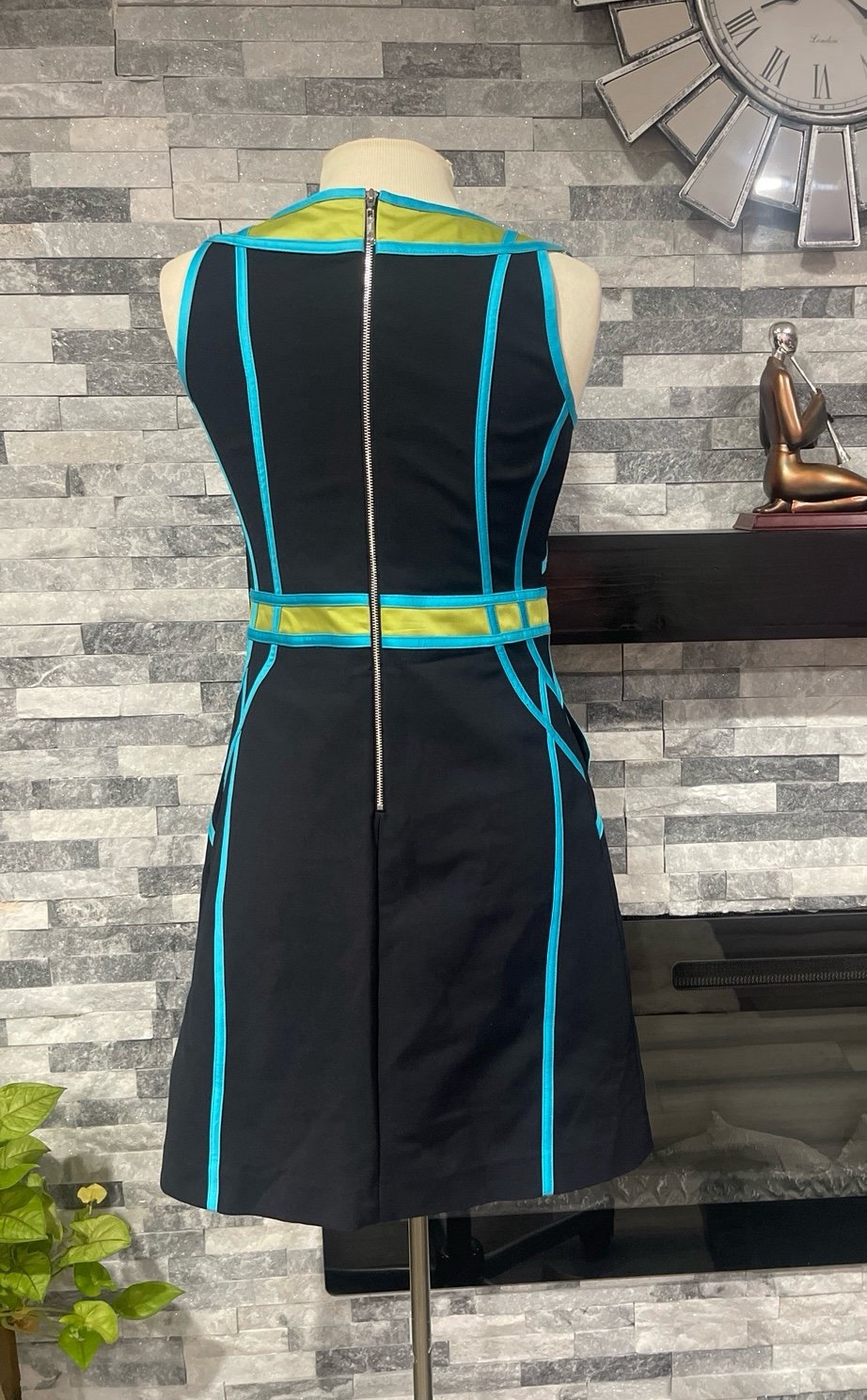 The Etcetera Bodycorn Sheath Dress in size 4 features a geometric pattern in black and blue green colors. This dress has a sleeveless design with a round neckline and a zip closure. Made from polyamide with a cotton fabric type, it offers stretch and pockets for added convenience. The above knee length and classic sheath style make it suitable for business occasions during the summer, fall, and spring seasons. Designed by Etcetera, this dress combines designer appeal with colorful accents for a versatile and stylish look.