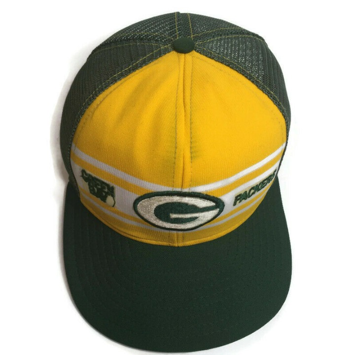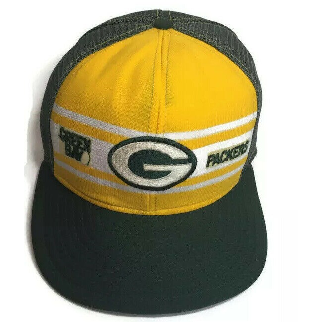 Vintage Green Bay Packers Superstripe AJD Snapback Trucker Hat.