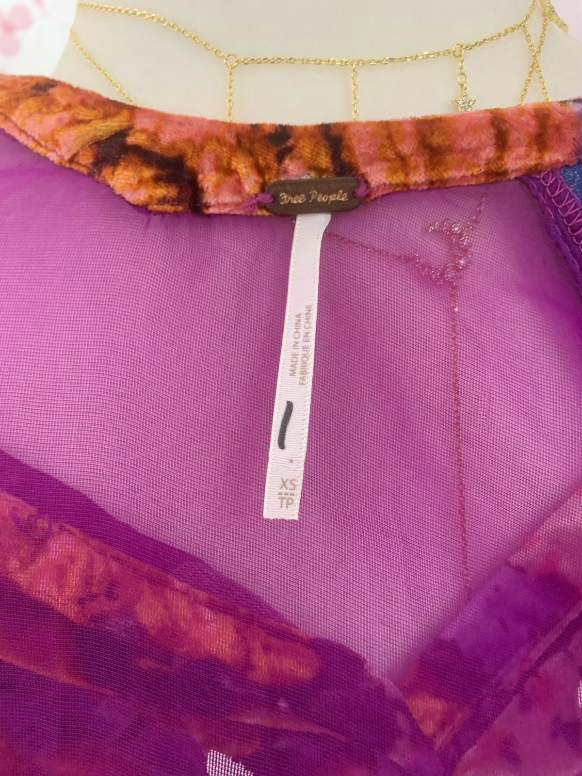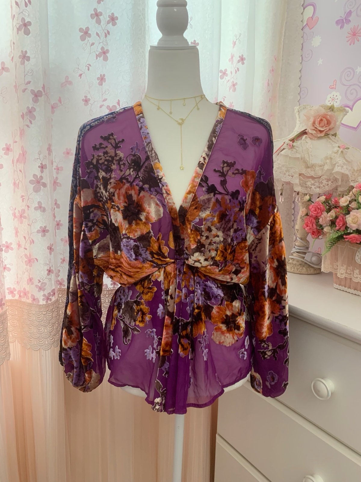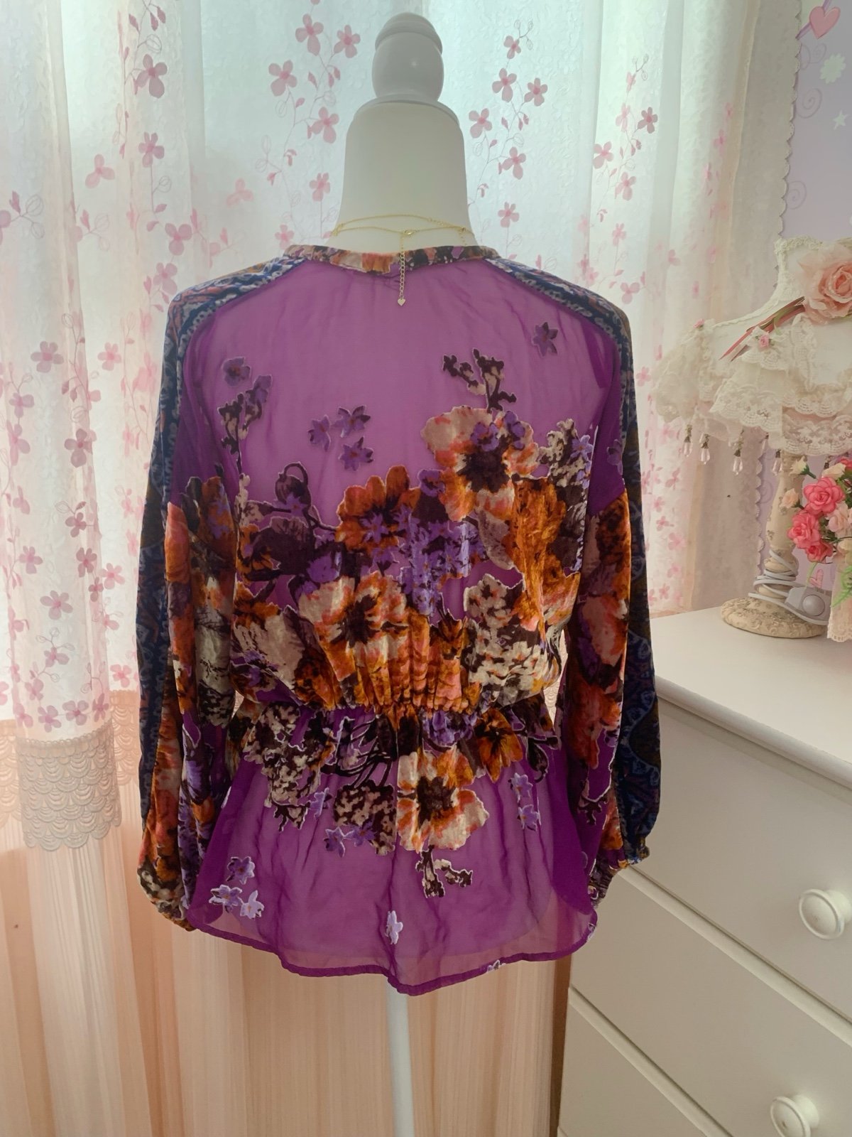 Stand out in this cool and colorful velvet top featured in a button-front silhouette with cinched waist for shape and sheer piecing throughout for added dimension.