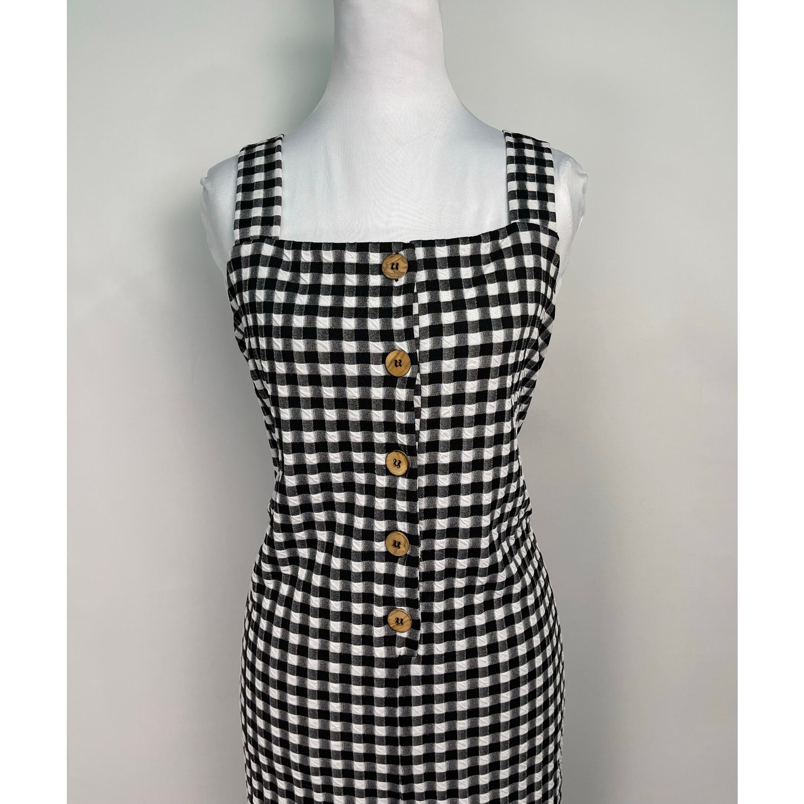 This Monroe-chic Maeve jumpsuit from Anthropologie features a classic black and white gingham check, wide leg silhouette, and flattering square neckline with shoulder straps. The fabric has a bit of stretch for a comfortable fit. Ready to wear to brunch or a garden party.