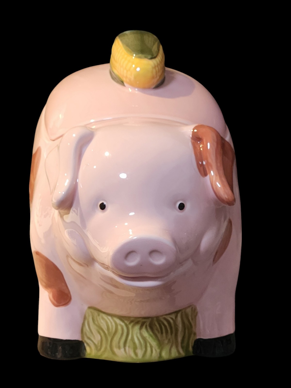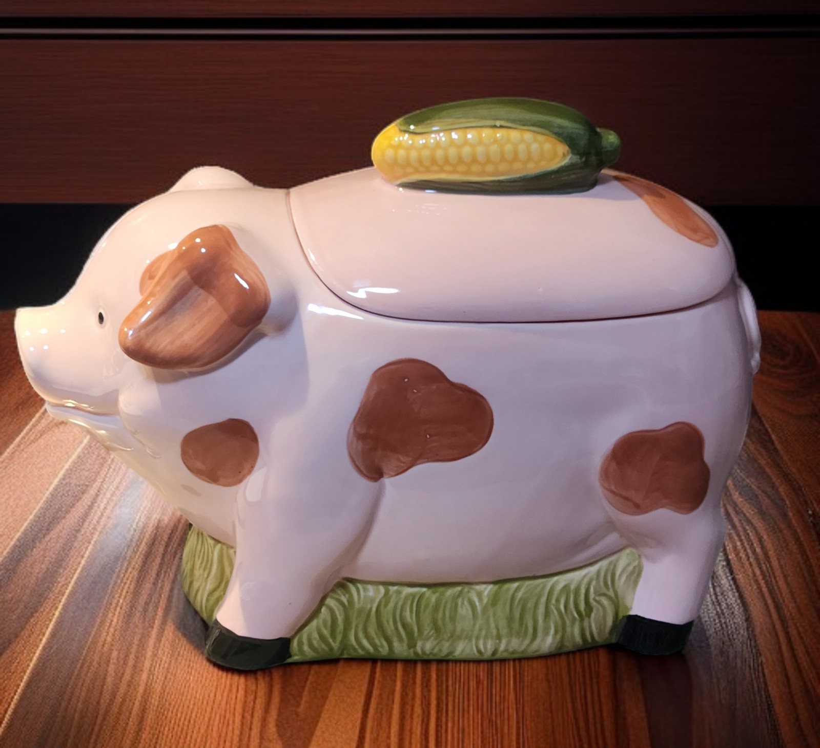 This adorable vintage cookie jar is of a pink pig with brown spots standing in green grass. On his back is a yellow corn cob with green leaves. This ceramic cookie jar was handcrafted in Japan in 1950. He is 9" tall x 12" long x 5.25" wide. Overall, this cookie jar is in very good condition. The only issue is a superficial crack on the bottom. As you can see in the pictures, it doesn't go through to the inside of the jar. There are no other chips, cracks, or damage. Please look carefully at all of the pictures and let me know if you have any questions.