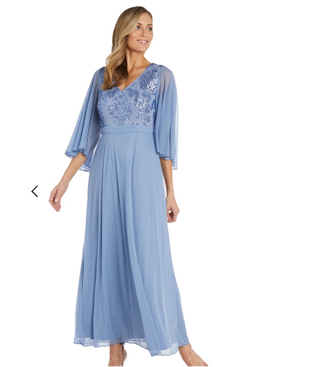 Look no further for the most stunning R&M Richards 99399 Long Formal Mother of the Bride Dress, a dramatic and glamorous Winter evening gown. The gown hugs the waist and hips before dropping from the thigh, including pleated inserts for volume and movement. Full sleeves keep you toasty, while a V-neck creates clean, original lines. The top has a fleur-de-lis sequin pattern that sparkles with each movement.