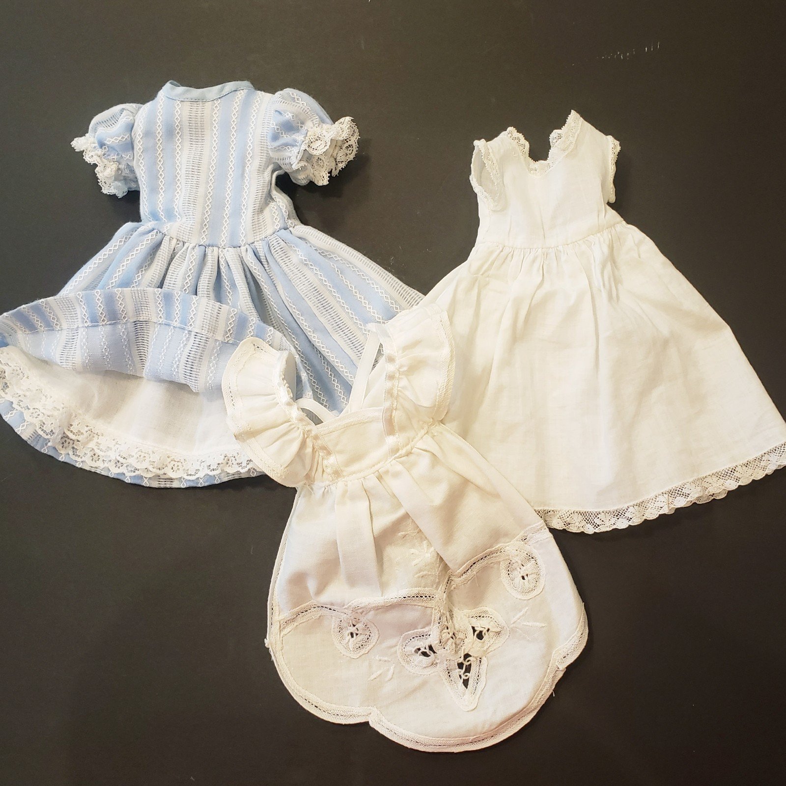 The dress & apron seem newer. They were on my doll when I purchased her many years ago. Her lace trimmed undergarments, the full slip & pantaloons look original. Body is firmly stuffed.