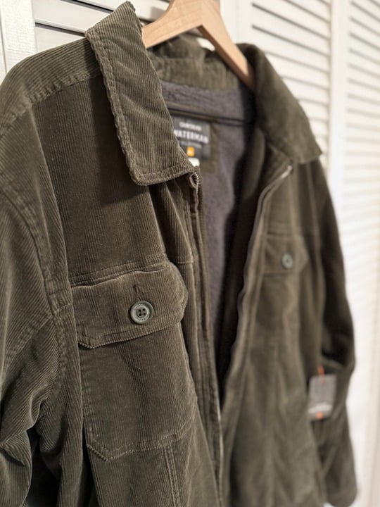 This Quiksilver Waterman corduroy jacket is the perfect blend of style and function. Designed in a sophisticated olive drab, it features a premium faux shearling (Sherpa) lining for added warmth and comfort. Made from high-quality 98% cotton and 2% elastane, this jacket is both durable and flexible.