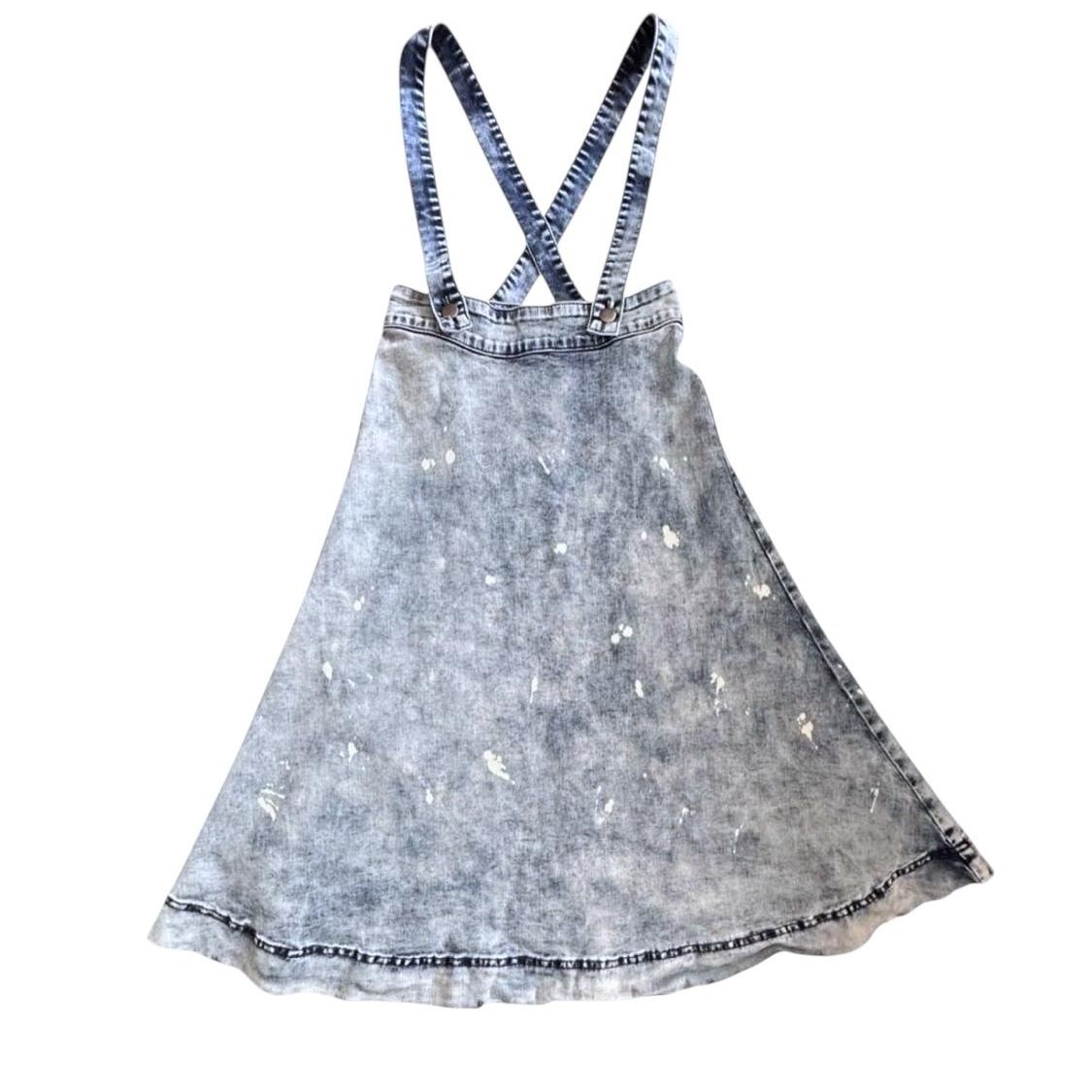 This unique Plenty by Tracy Reese suspender skirt combines a light blue acid wash with distinctive paint splatters for an effortlessly cool look. An A-line silhouette and adjustable suspenders offer a comfortable, versatile style perfect for a vintage-inspired or bohemian aesthetic. Crafted from a cotton-spandex blend, it provides comfort and a flattering fit for your casual wardrobe.