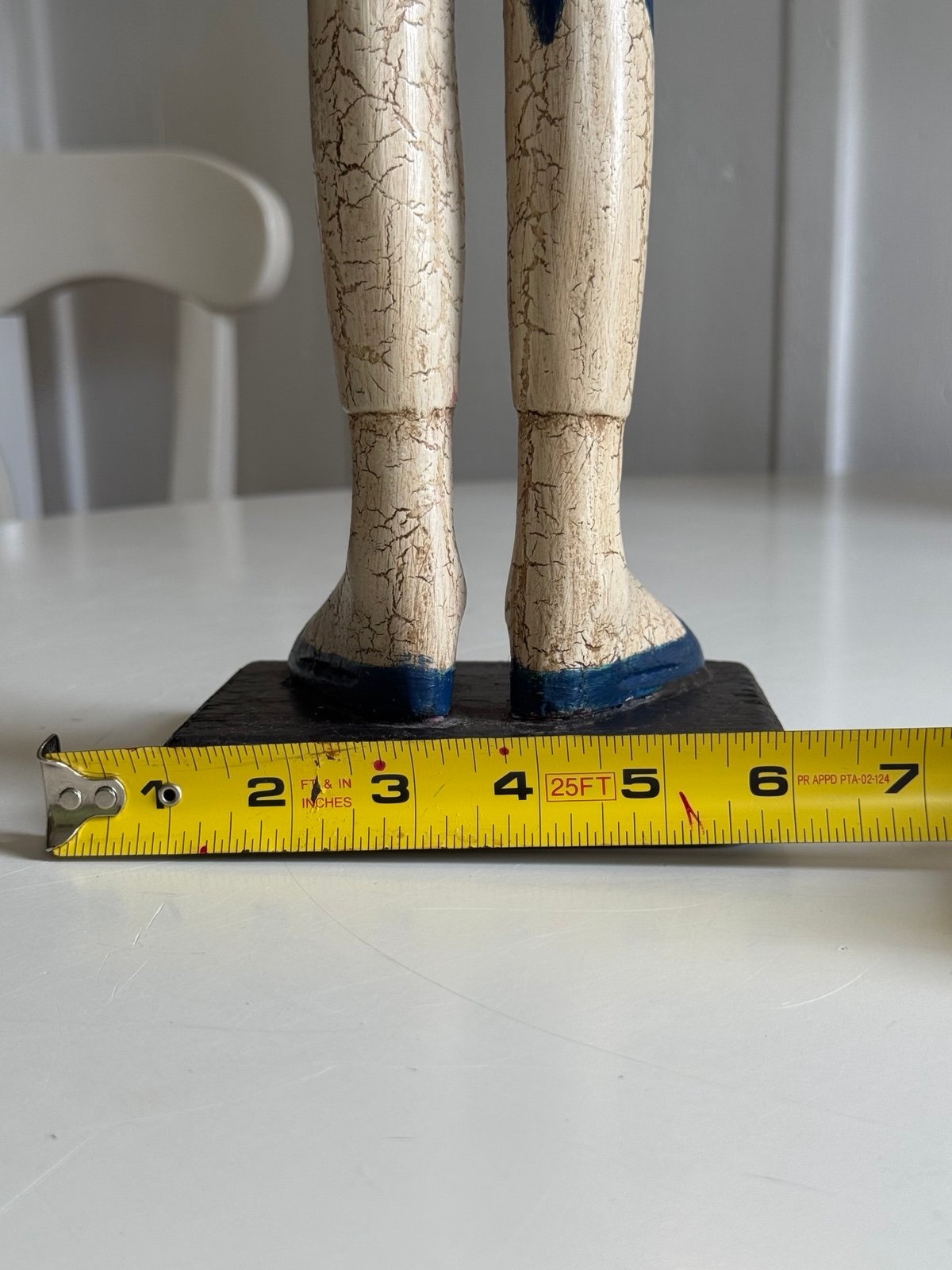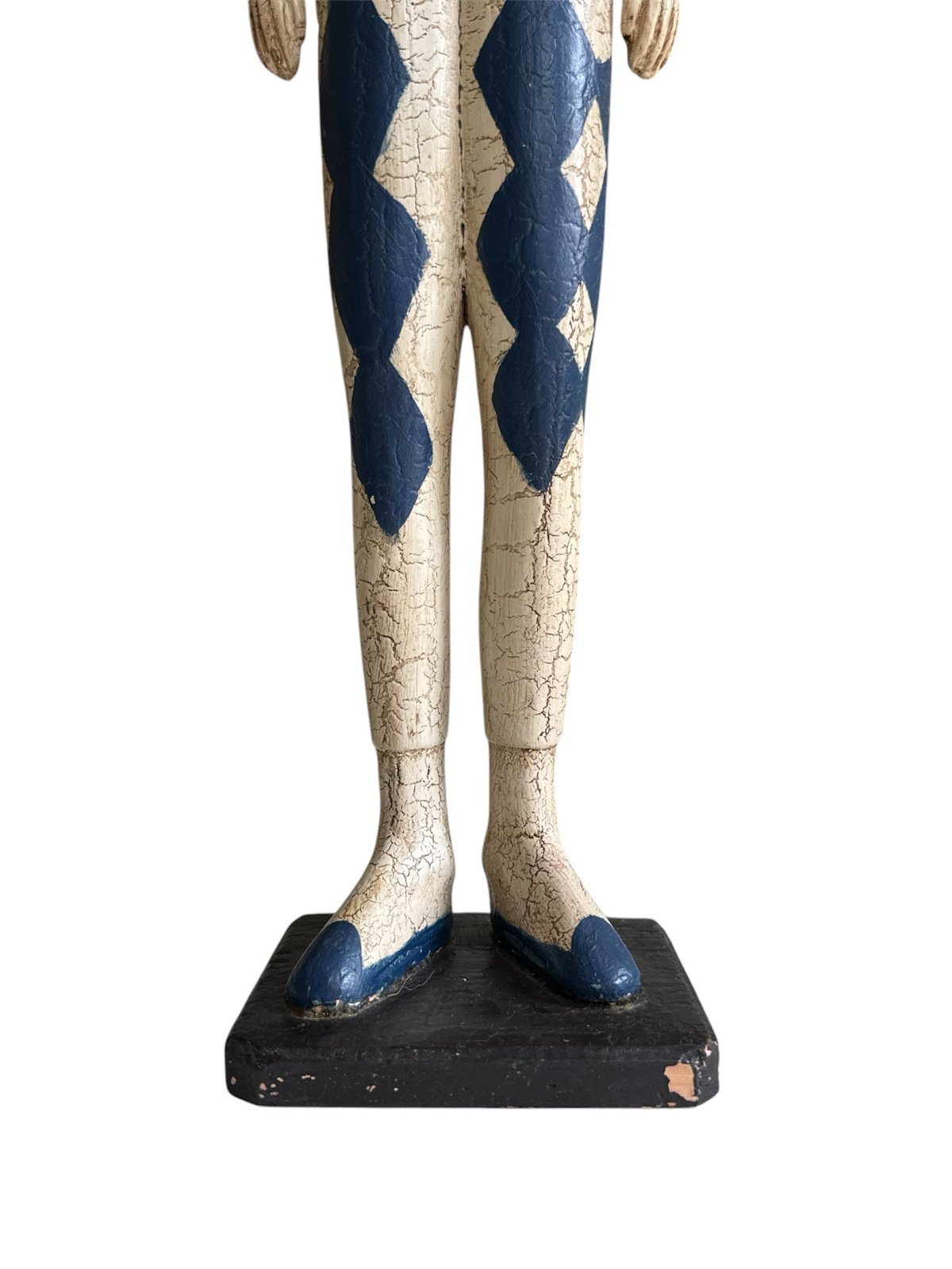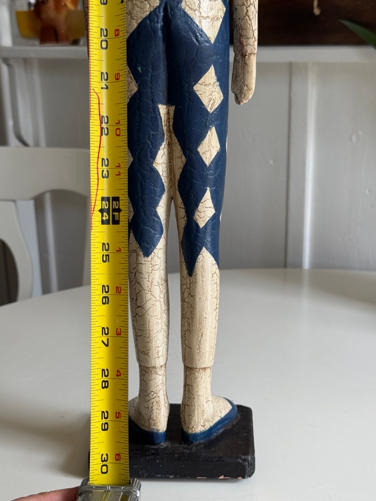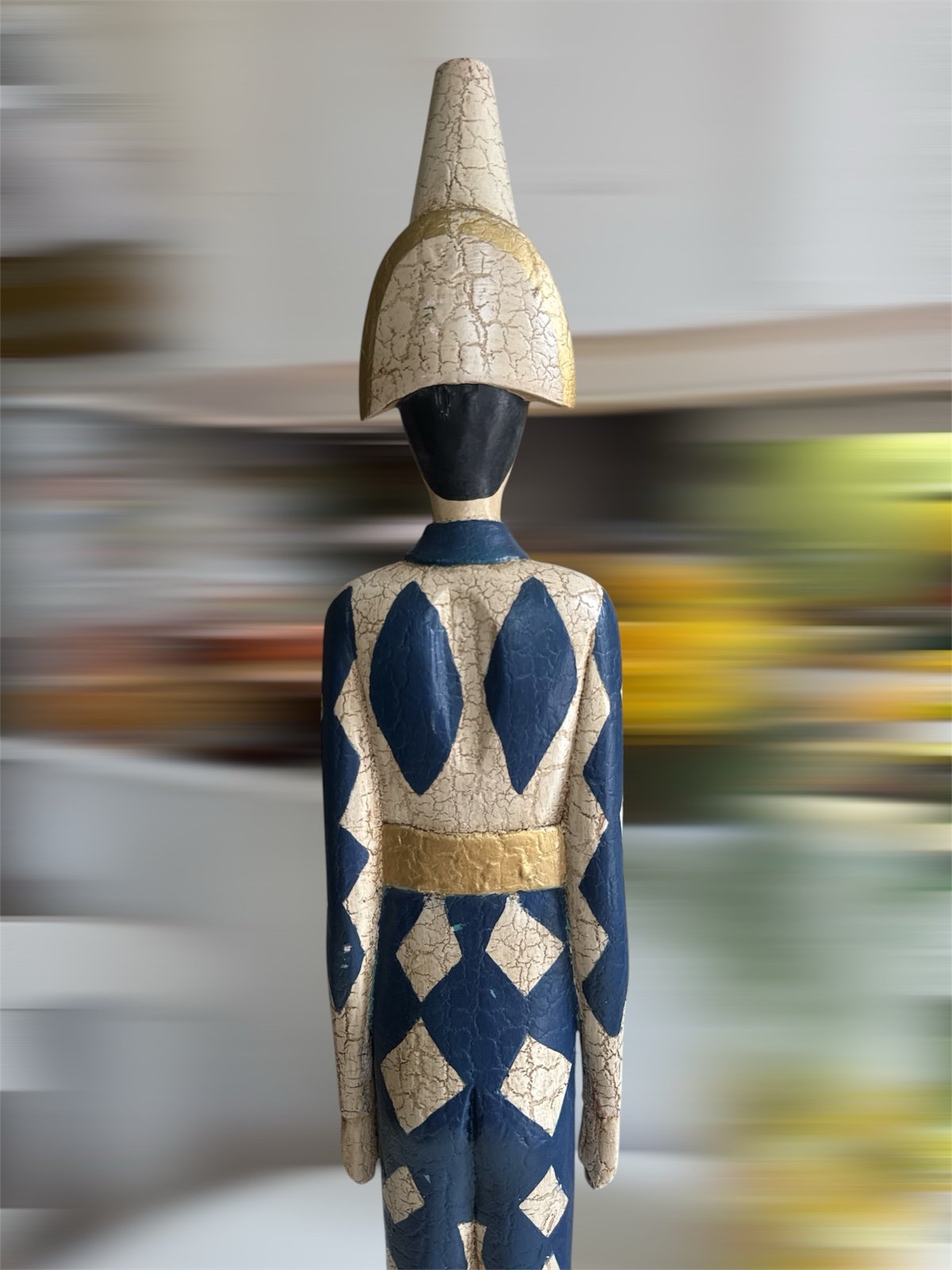 * we’re about to take to sell at a auction house so if you want them make offer or buy asap* He stands 30 inches tall. Weighs about 5 pounds. He is hand painted in blue and cream ivory off white diamonds with gold details. He is very collectible. When I bought the pair of these at an estate sale EVERYONE stopped me about them. They all wished that I would put them down. The other one I have listed is a little bit taller and is black diamonds. Another seller sold this as a Mackenzie Childs piece. I’m not sure. I’d say it is Mackenzie Childs “style” either way it is very cool and unique