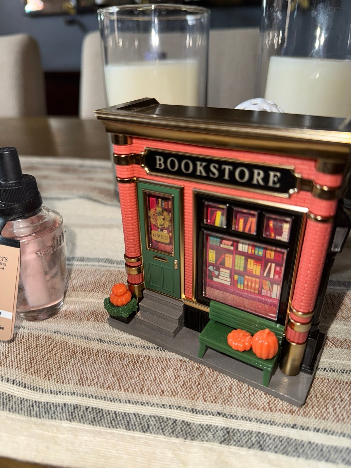 This unique plug-in features the front of a cheerful, brick bookstore, complete with pumpkins perched on a little dark green bench. In addition to working as a fragrance diffuser, the device doubles as a functioning projector that can scatter soft images of falling leaves, coffee cups, and books across the wall.