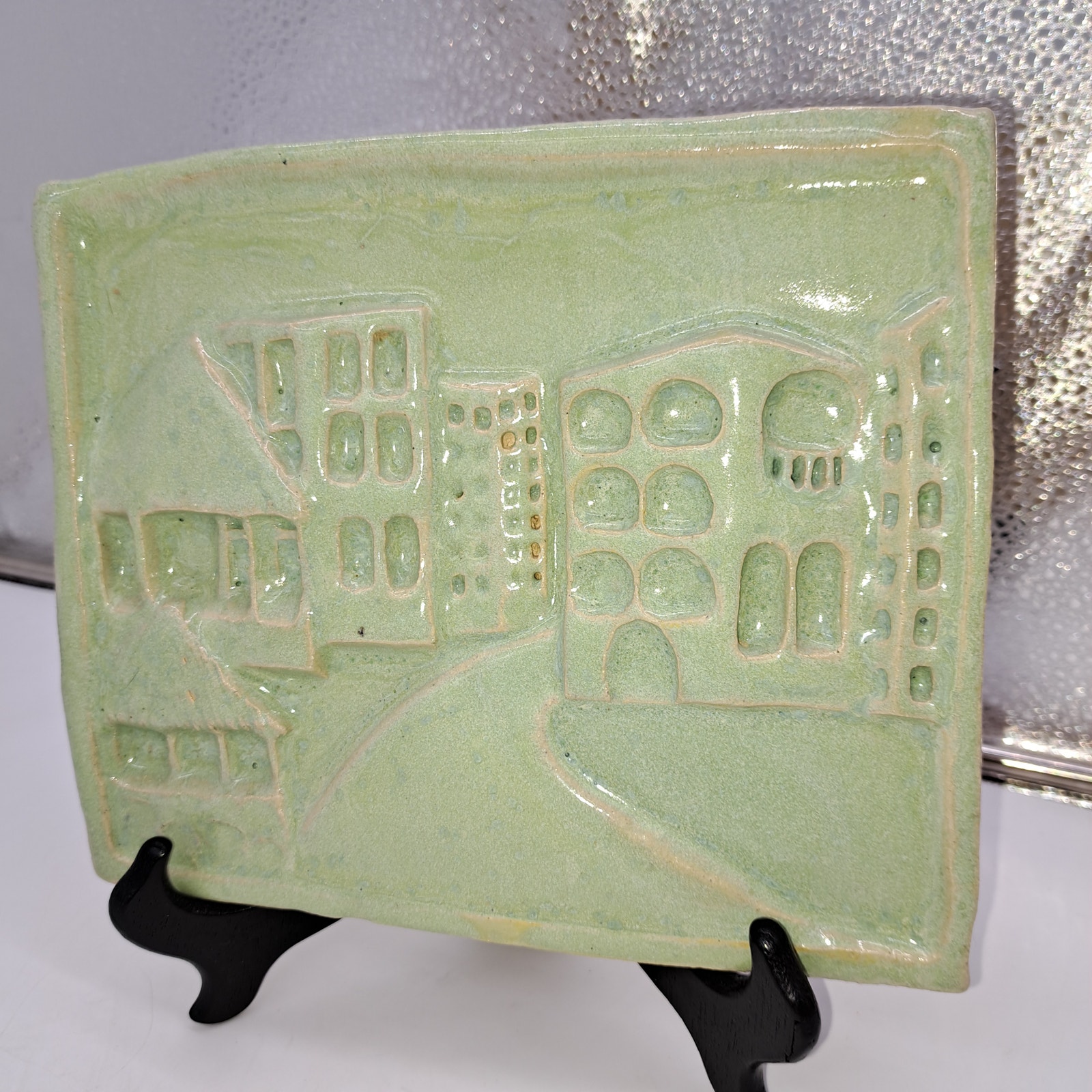 Artist signed dated '05 Sage Green Celedon Pottery Tile carved 3D buildings with heavy detailing of windows and buildings using translucent glazes. Because they can be seen through, they are perfect for work with fine details or carving. Display using a plate stand or leaning it in book shelf. One of a kind. Rare piece. Katherine Doane, Savannah. Teacher of pottery ceramics.