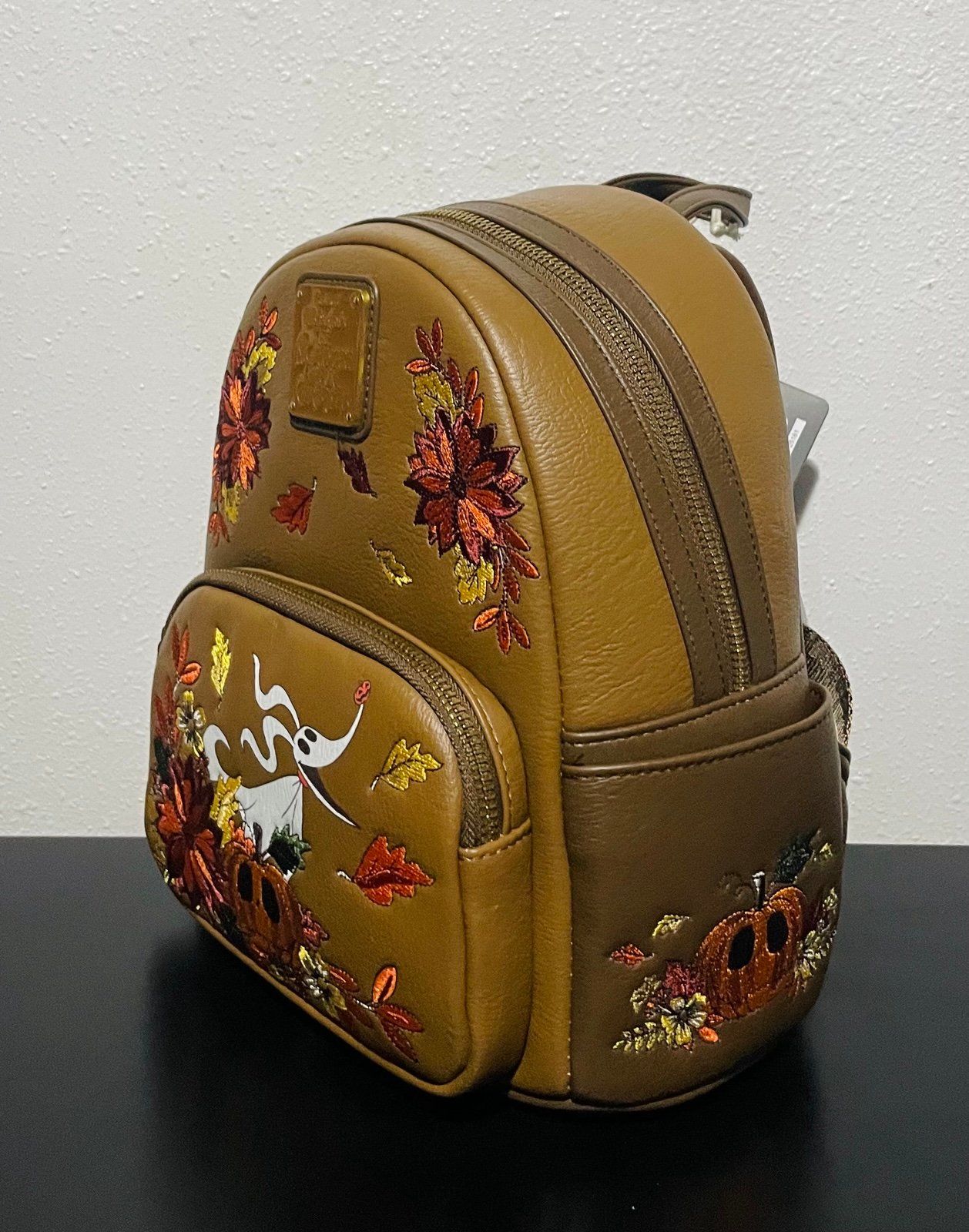 Get ready for fall with this Nightmare Before Christmas mini backpack! Featuring embroidered fall foliage and Jack Skellington as a pumpkin, the front also includes a glow-in-the-dark Zero. With side pockets and adjustable traps, this bag is perfect for the season.