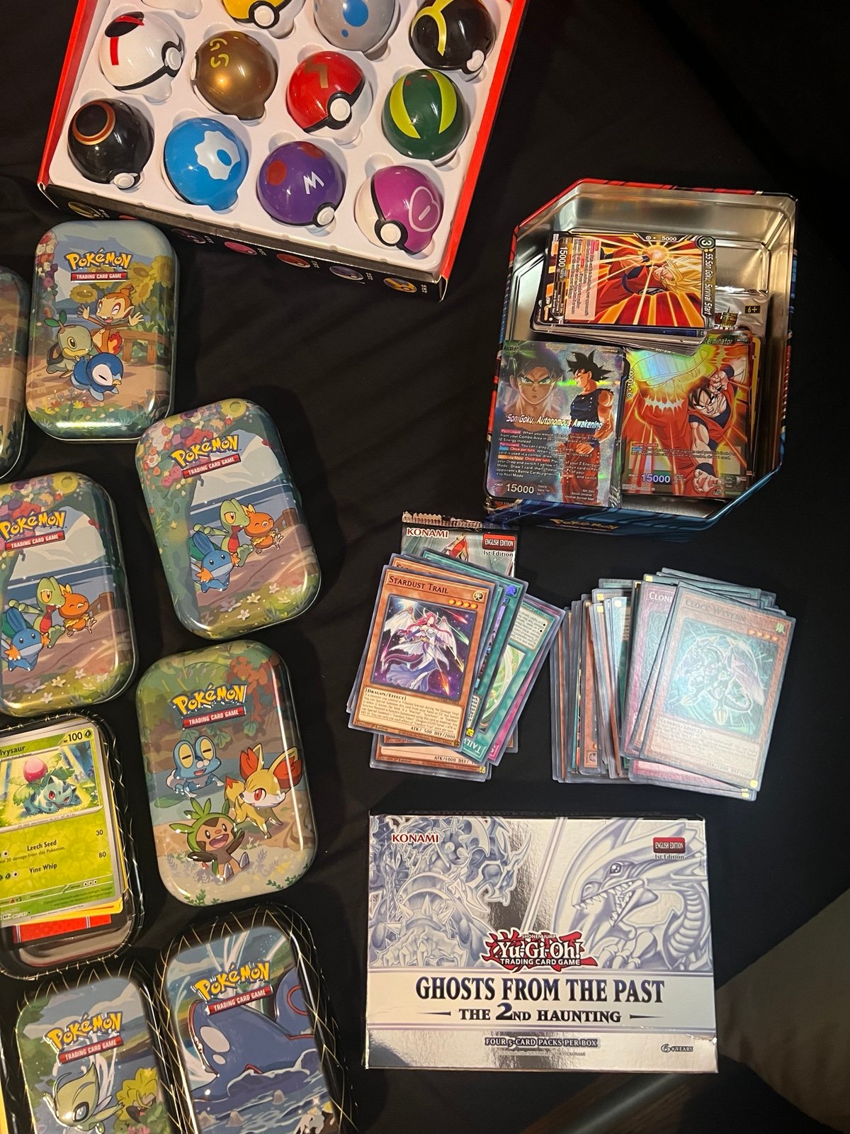 Huge Pokemon card selection all generations. Plus Yu-Gi-Oh. And dragon ball z card collection. Everything you see in pictures will be sold including the 2 binders. Can negotiate. All tins are OPEND and completely full with cards as well. ALL PACKAGES AND TINS ARE OPENED!!!!!
