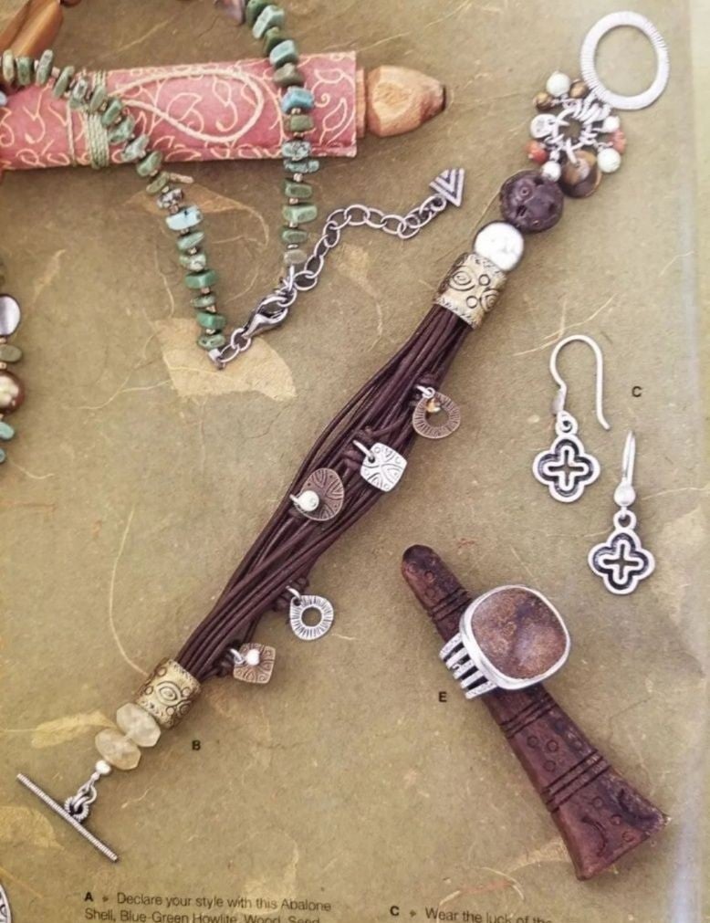 B1889 Brown Leather Bracelet garnished with Brass, Sterling Silver, Howlite, Coral, carved Bone Bead, Rutilated Glass, Tiger's Eye and Freshwater Pearl Cha-Chas.