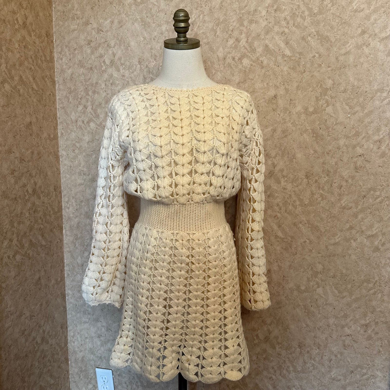 VTG 60s Roncelli Hand Crochet Wool Cream Lace Pointelle Knit Dress