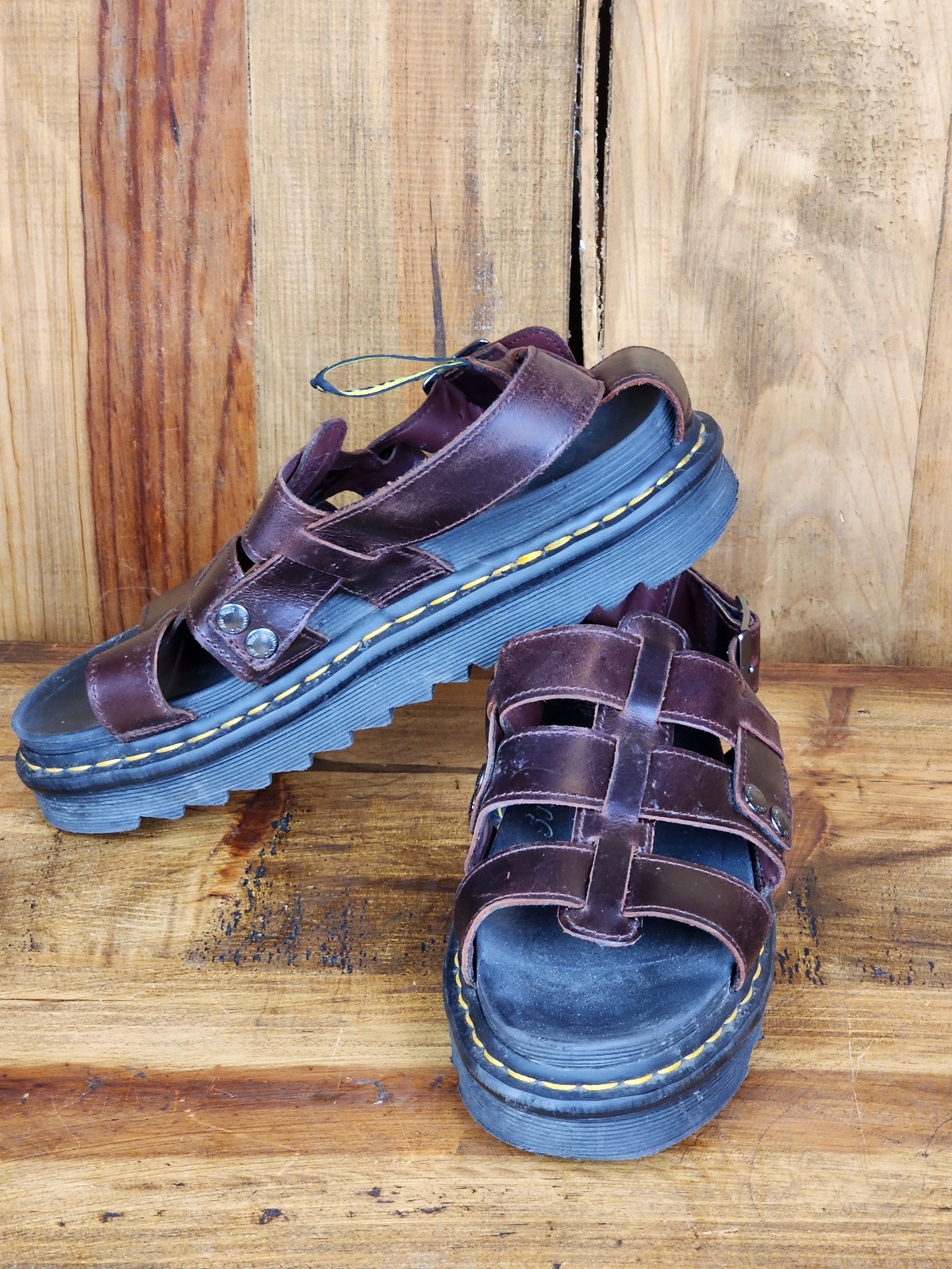 Gently used with some scuffing and visible sole wear; leather in great condition.