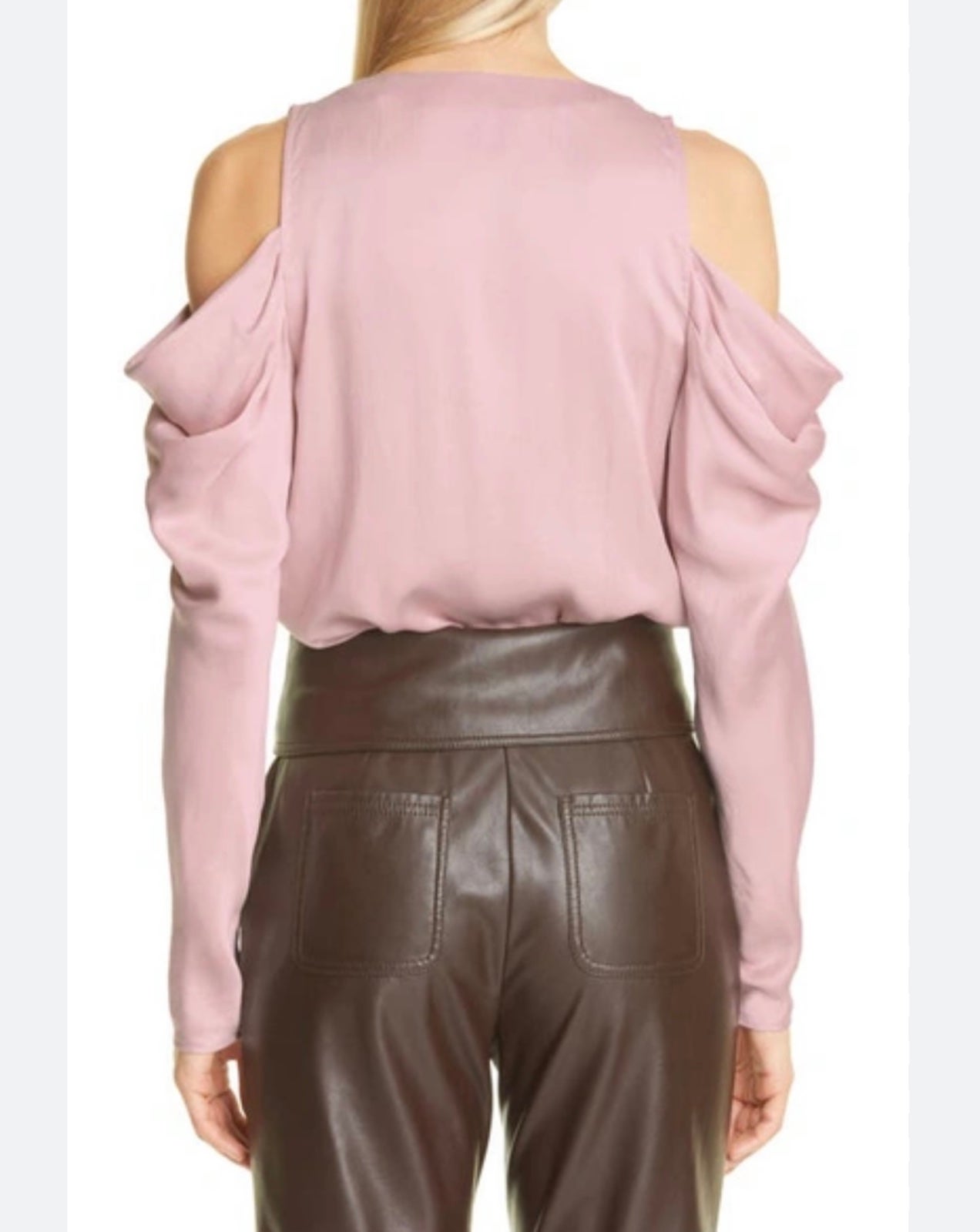 Draped along a cold-shoulder silhouette in beautiful smooth pink silk, Jonathan Simkhai's Remington blouse is wrapped at the bodice for a plunging v-neckline. Pullover style. Size XSl and New with tags. Retail $295.
