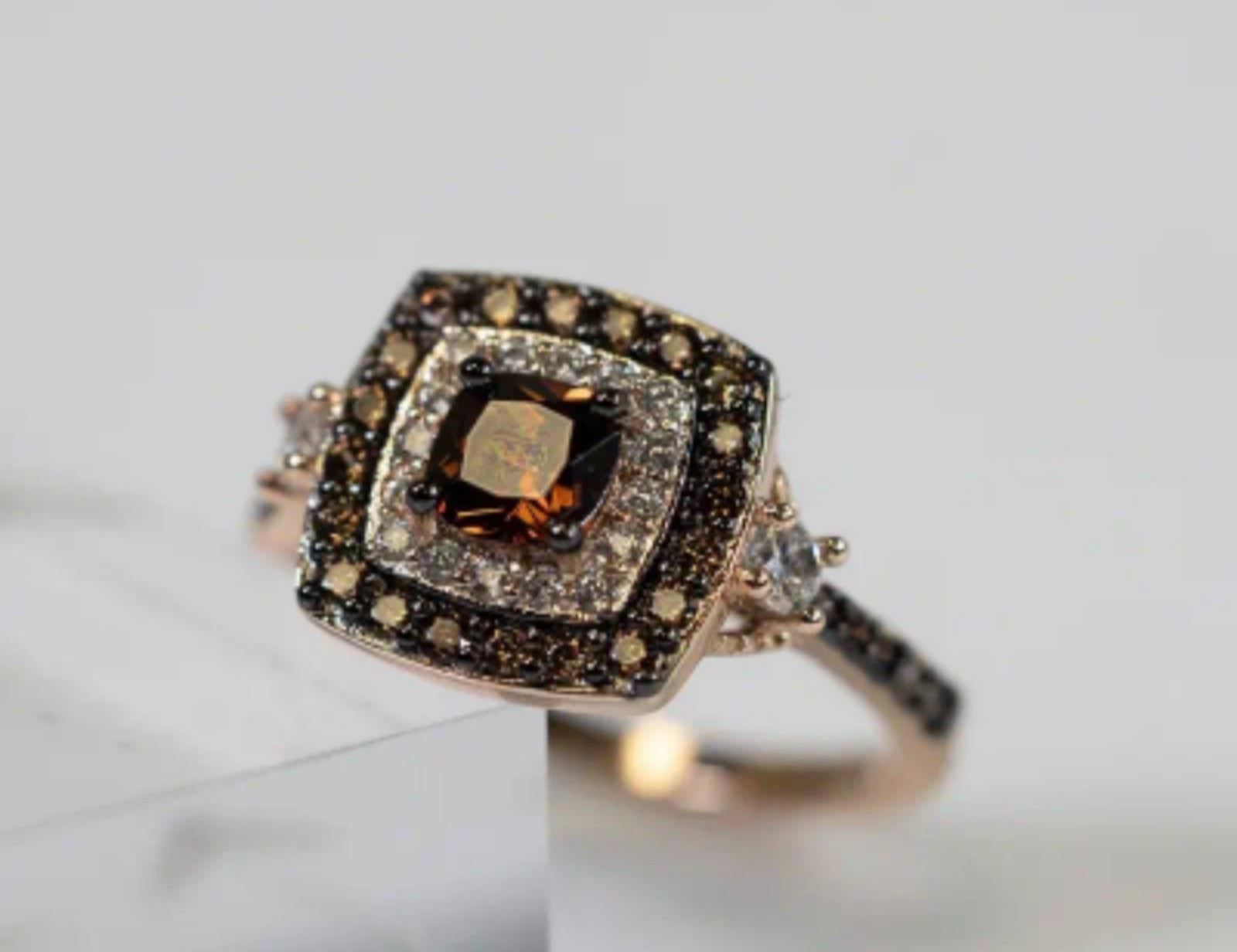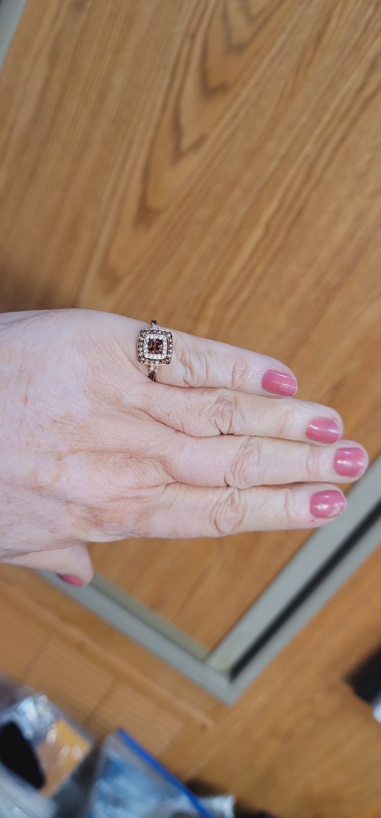 Lucious Chocolate cz 5x5mm Princess cut center stone with double row chocolate and white diamonds cz halo. All prong set. Size 7.