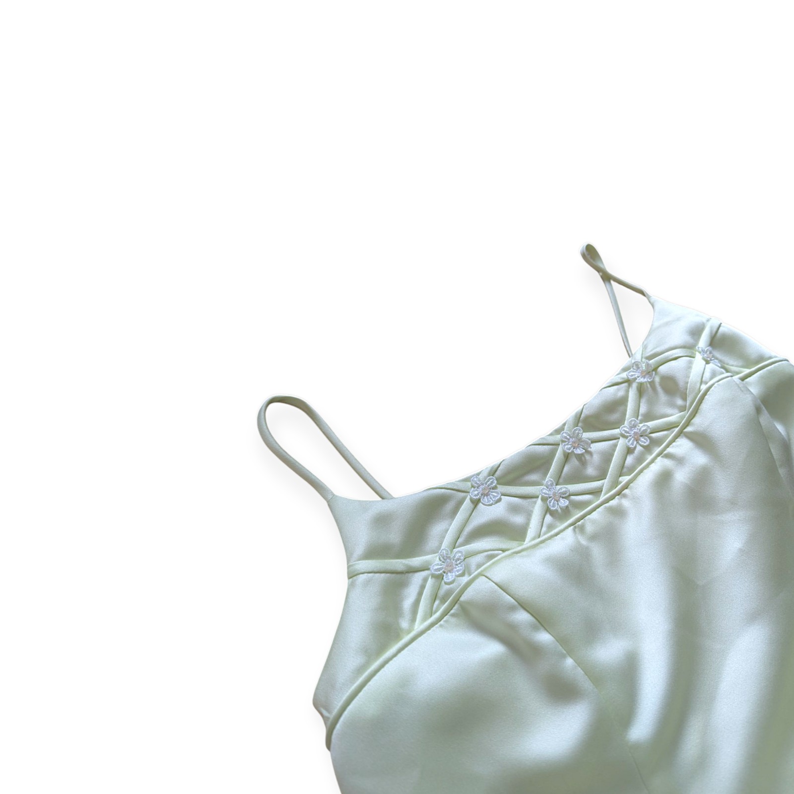 Light green with small daisy appliques and a corset closure back. Crinoline layer underneath.