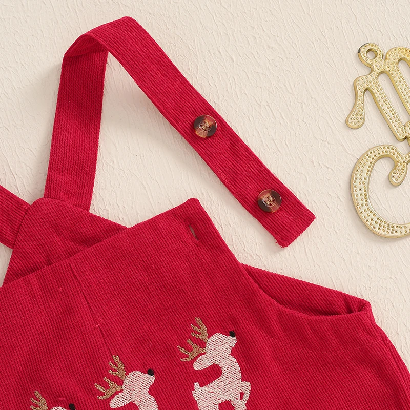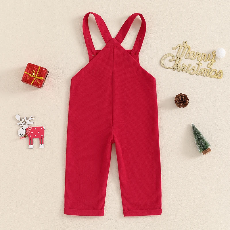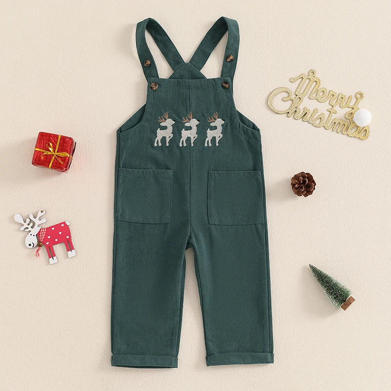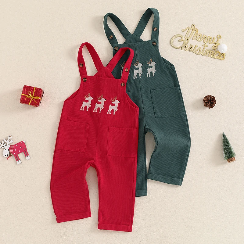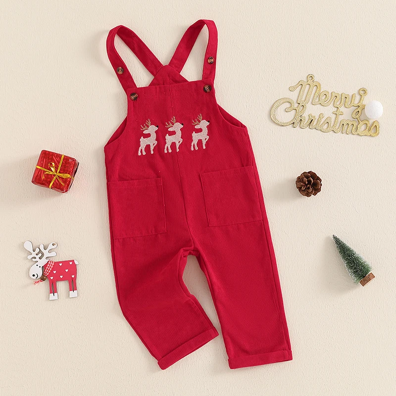 Christmas Toddler Girls Boys Overalls Reindeer Embroidered Sleeveless Straps Pockets Romper Jumpsuit