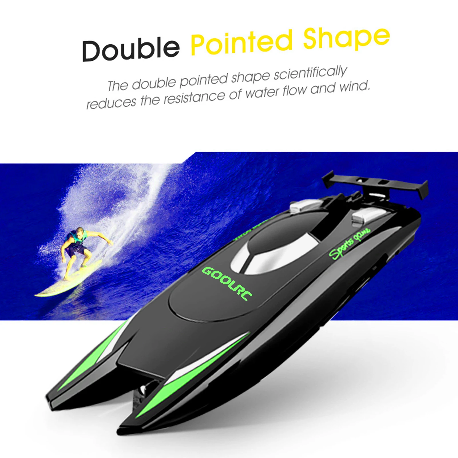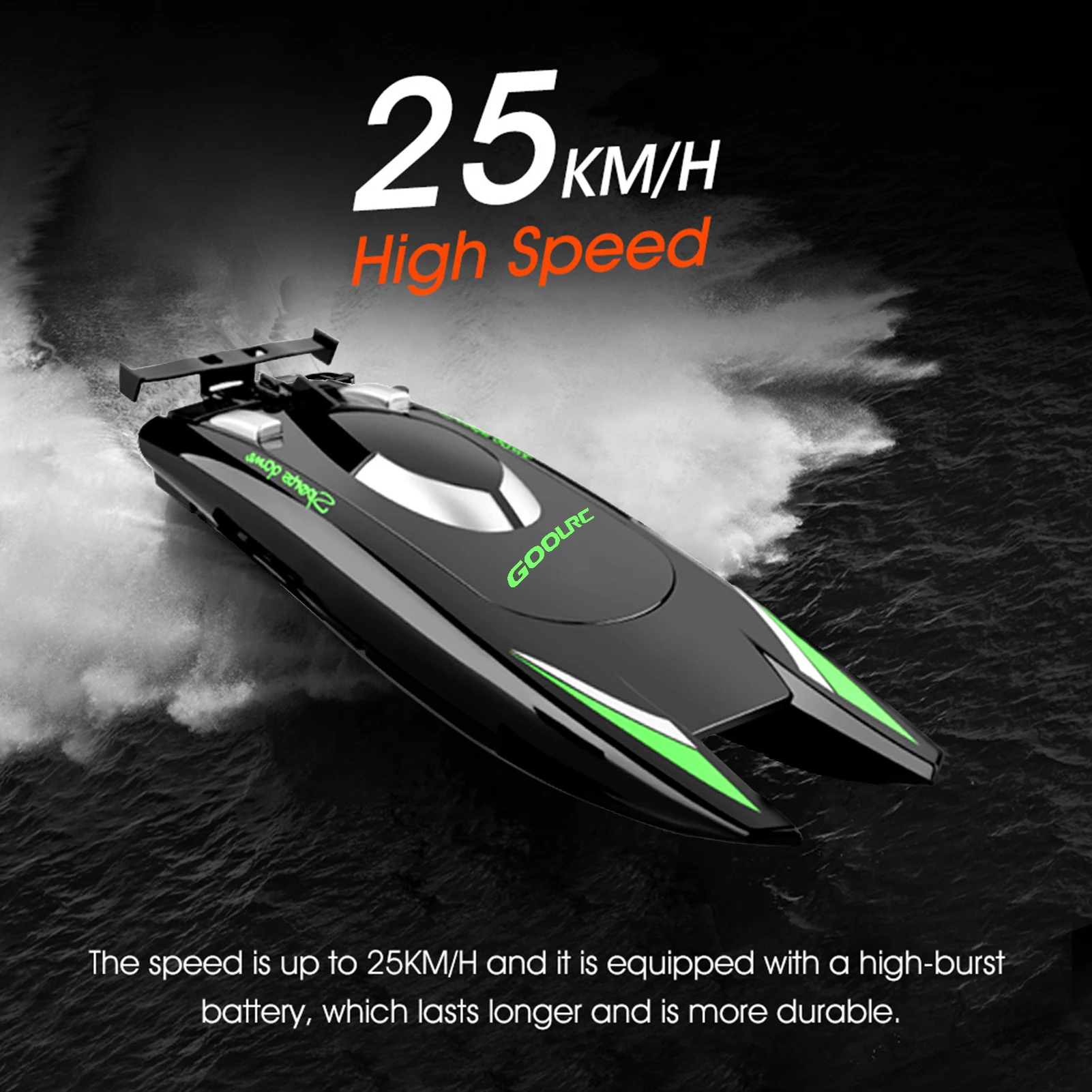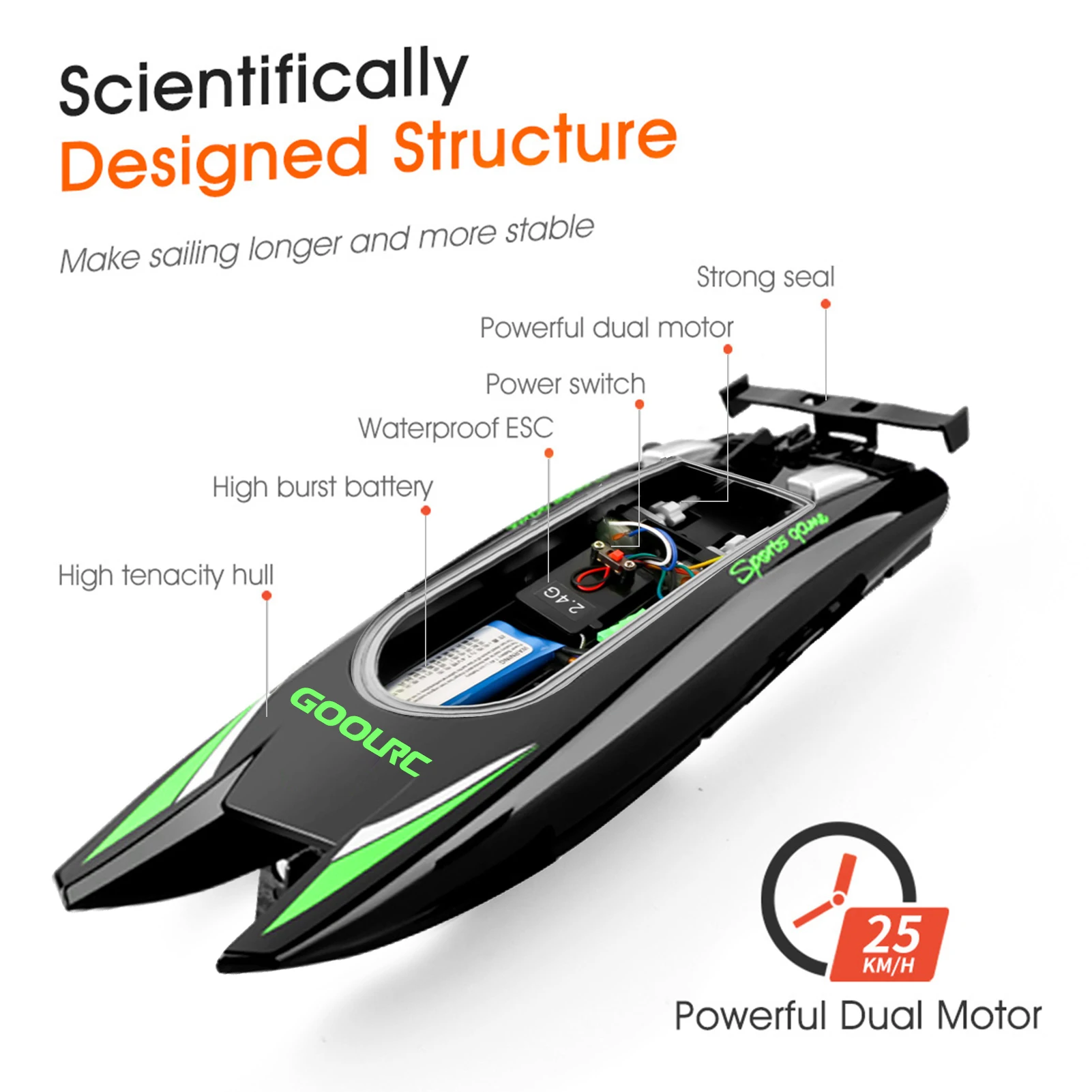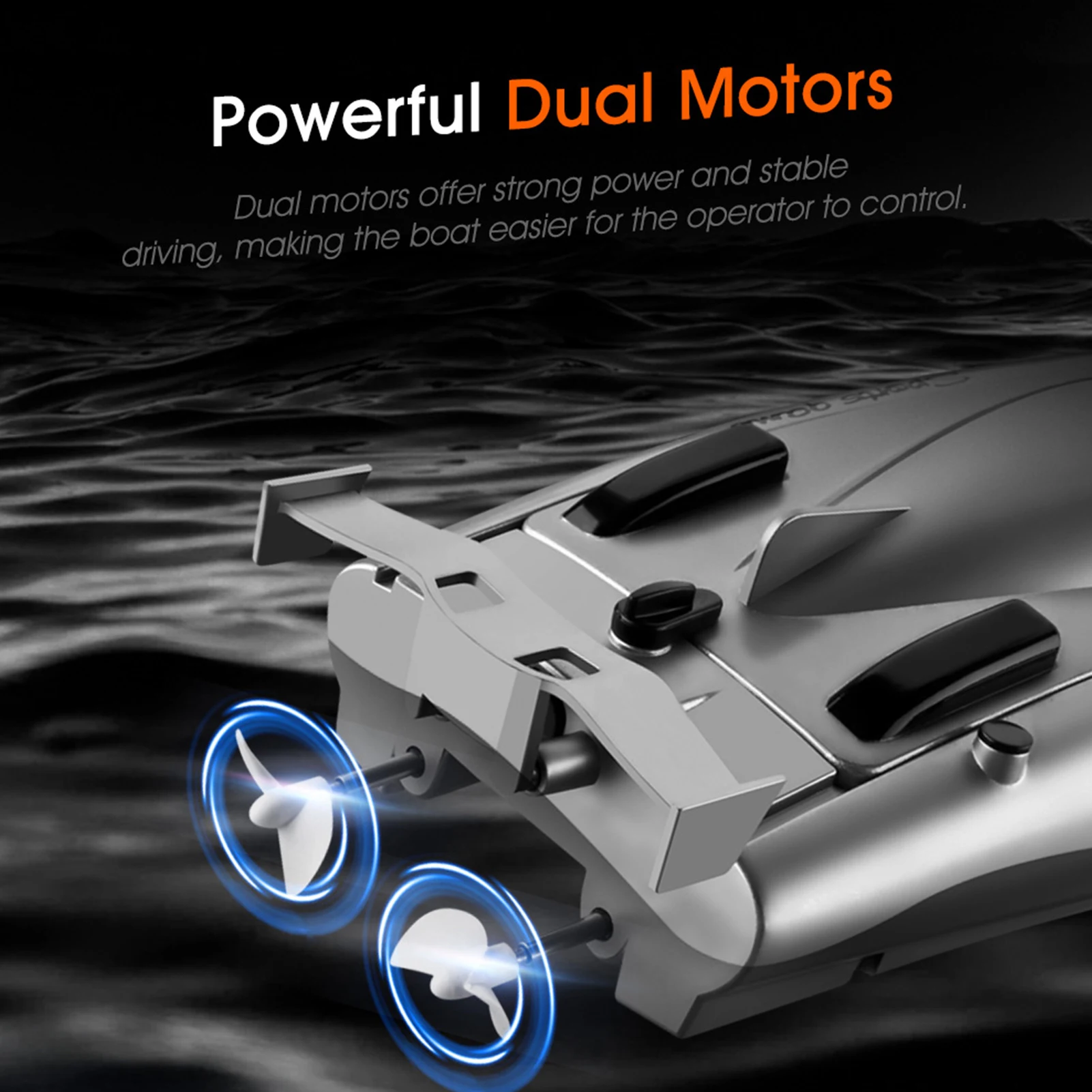 This RC boat in a special double-pointed shape features powerful dual-motor, 25mins long using time and 2.4Ghz anti-interference control. Its speed is up to 25KM/H and it is equipped with a high-burst battery, which lasts longer and is more durable.