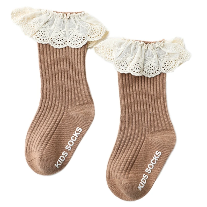 Toddler Infant Baby Girls Knee High Socks with Grips Ruffled Lace Patchwork Ribbed Knit Solid Color Non-Skid Cotton Long 900C