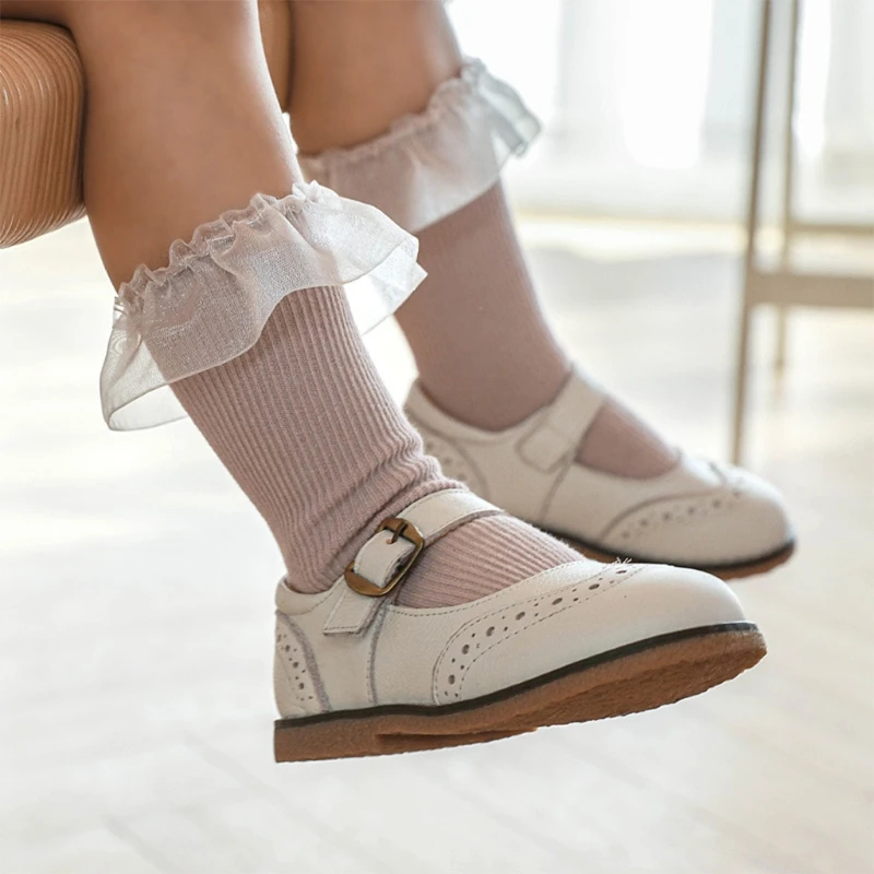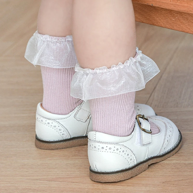 Sweet ruffled lace patchwork, ribbed knitted, solid color, double needle. Every baby girls love them.