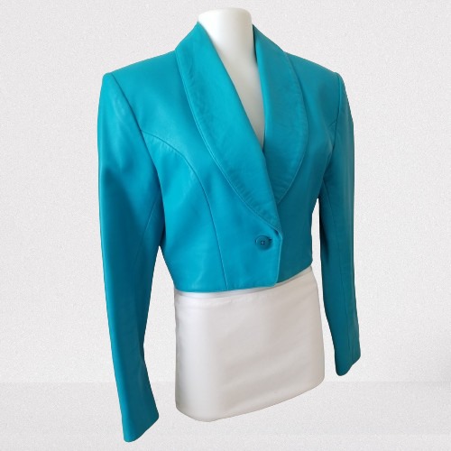 Gorgeous turquoise soft-as-button leather crop jacket by Michael Hoban/North Beach Leather. Coat has a long lapel collar and single button closure.