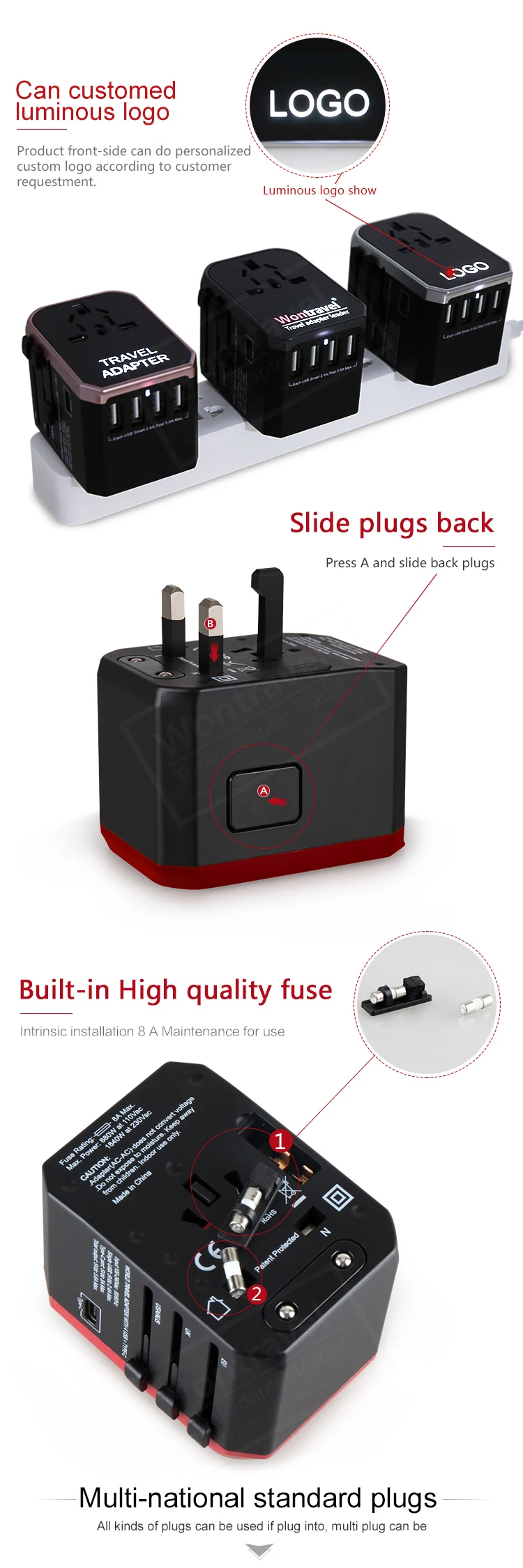 Verbatim brand product, Plug Lock and safe shutter design, 8A Overload dual fuse, short circuit and overload protection,CE, FCC,E1703 and ROHS etc International safety certification, kindly feel free to use our universal world travel adapter.