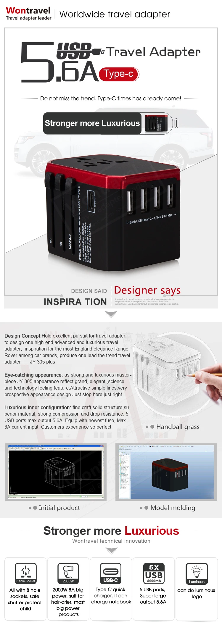 All in one world multi-function travel power adapter, this travel adapter adopts retractable plug design, have 4 USB ports +1Usb-C port,USB maximum output is2.4A,and Usb-C maximum output is 3.0A,the 5 ports maximum total output is 5.6A,4 USB + Type-C can be used at the same time, 4USB with Smart IC, Can charge most electronic devices.