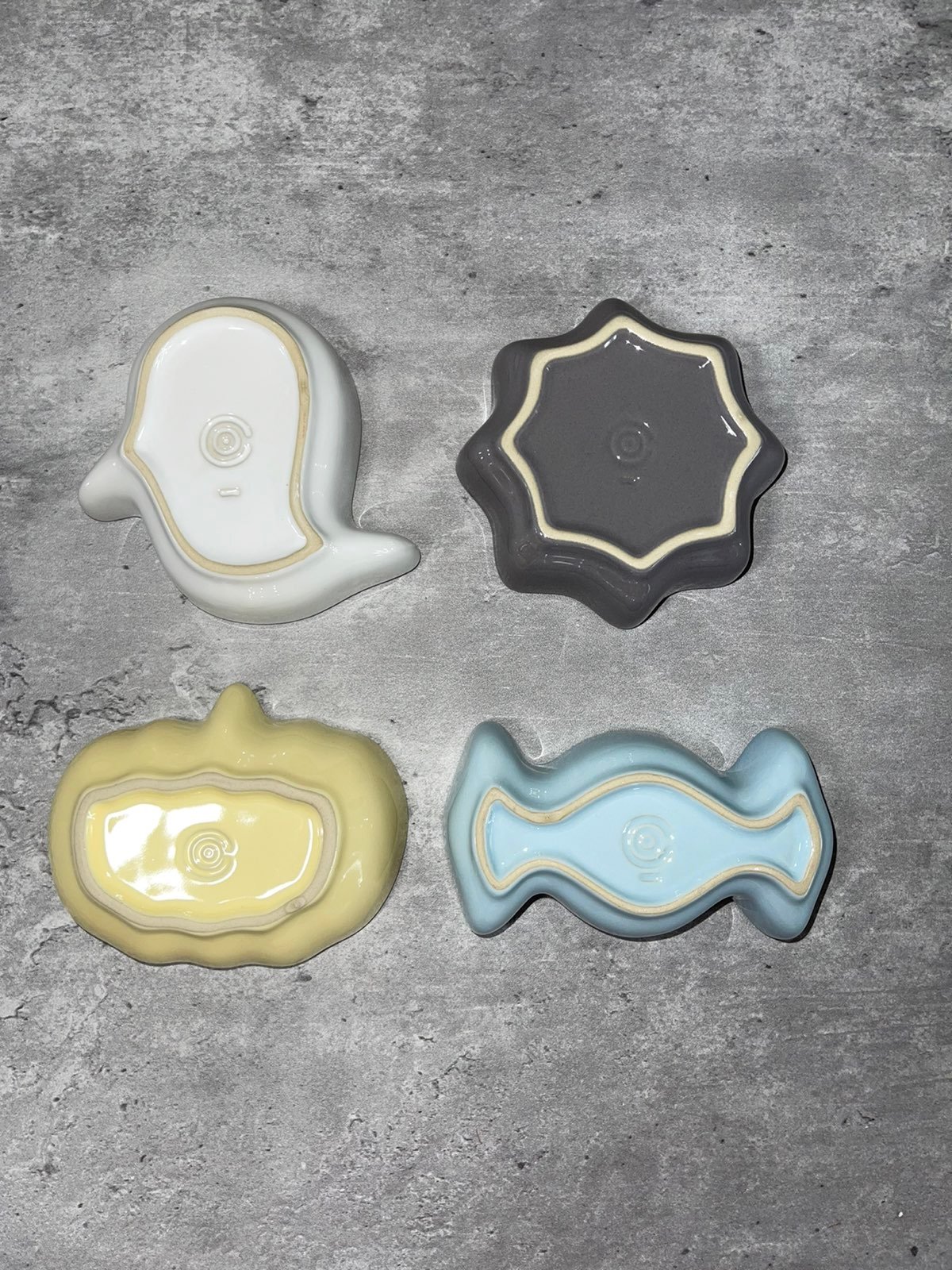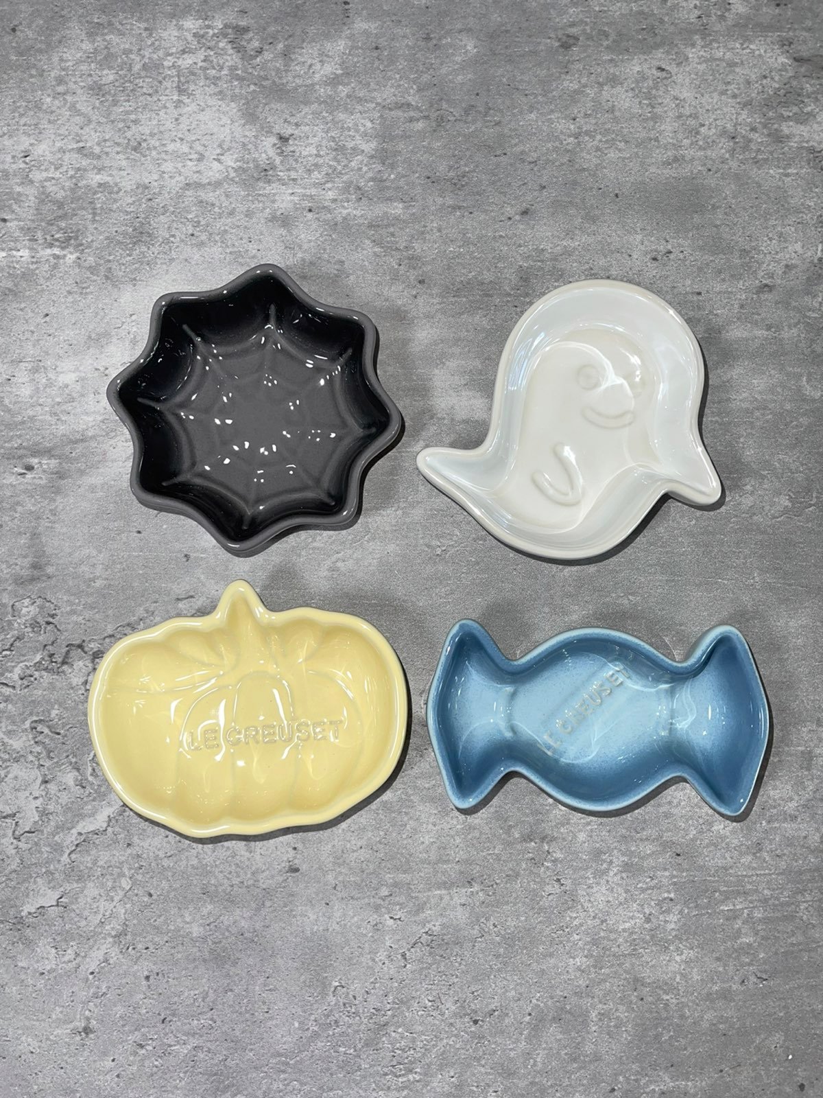 Color: Pumpkin in Custard Yellow, Ghost in Pearlized White, Spider Web in Flint and Candy in Coastal Blue