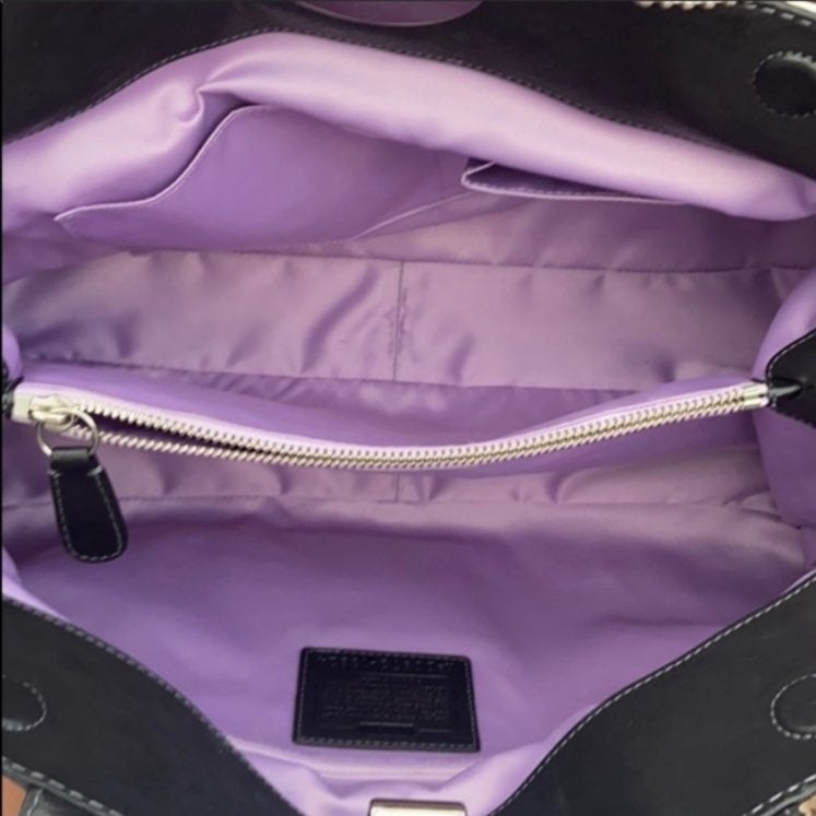 Looks like brand new❣️ Very gently preloved black leather Coach shoulder / hand bag / satchel. Silver hardware and beautiful lilac satin interior. This bag was only worn a handful of times. Large roomy interior with a zippered interior center divider for great organizing, another inside zippered pocket and 2 smaller open pockets. Bag is in pristine condition! Bag closure has 2 magnets as well as twist lock. 4 Silver feet on bottom of bag. 10 in tall, 16 wide, 5 deep. Flat double shoulder straps with a 7.5 inch drop (fits comfortably on shoulder (thanks to the flat straps) and under arm.