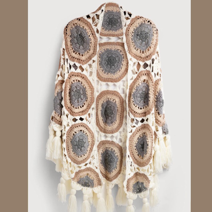 Boho-Chic Design – Eye-catching circular motifs and playful tassel fringe add a whimsical, bohemian flair.