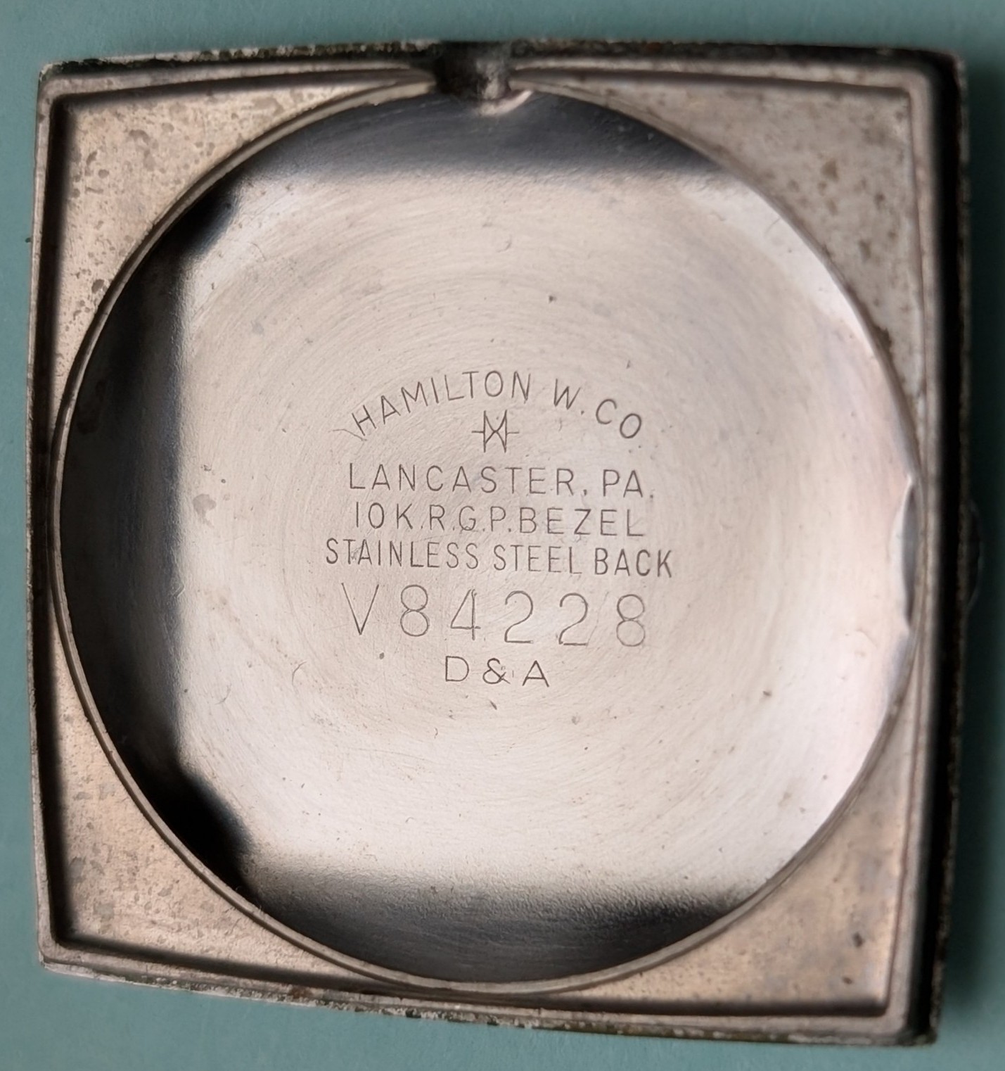 This is a beautiful Hamilton Trevor from 1959! It was only produced for one year so it's not one you see very often. The white dial has a circular textured pattern and is in fantastic condition. The case has a 10k RGP bezel and sterling silver back. It's in great shape and has its original signed crown. It's a decent size for a vintage watch, measuring 28 x 28.5 mm.