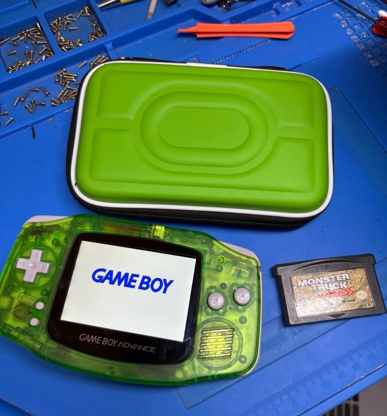 This is an original GBA motherboard and new shell with a brand new backlit IPS V2 screen! Brightness adjuster by holding down select and using the L and the R triggers. Works and plays great! Feels like you have a brand new system in your hands. Comes with carry case and cart! Batteries not included. Please message me with additional questions. Free Priority shipping!