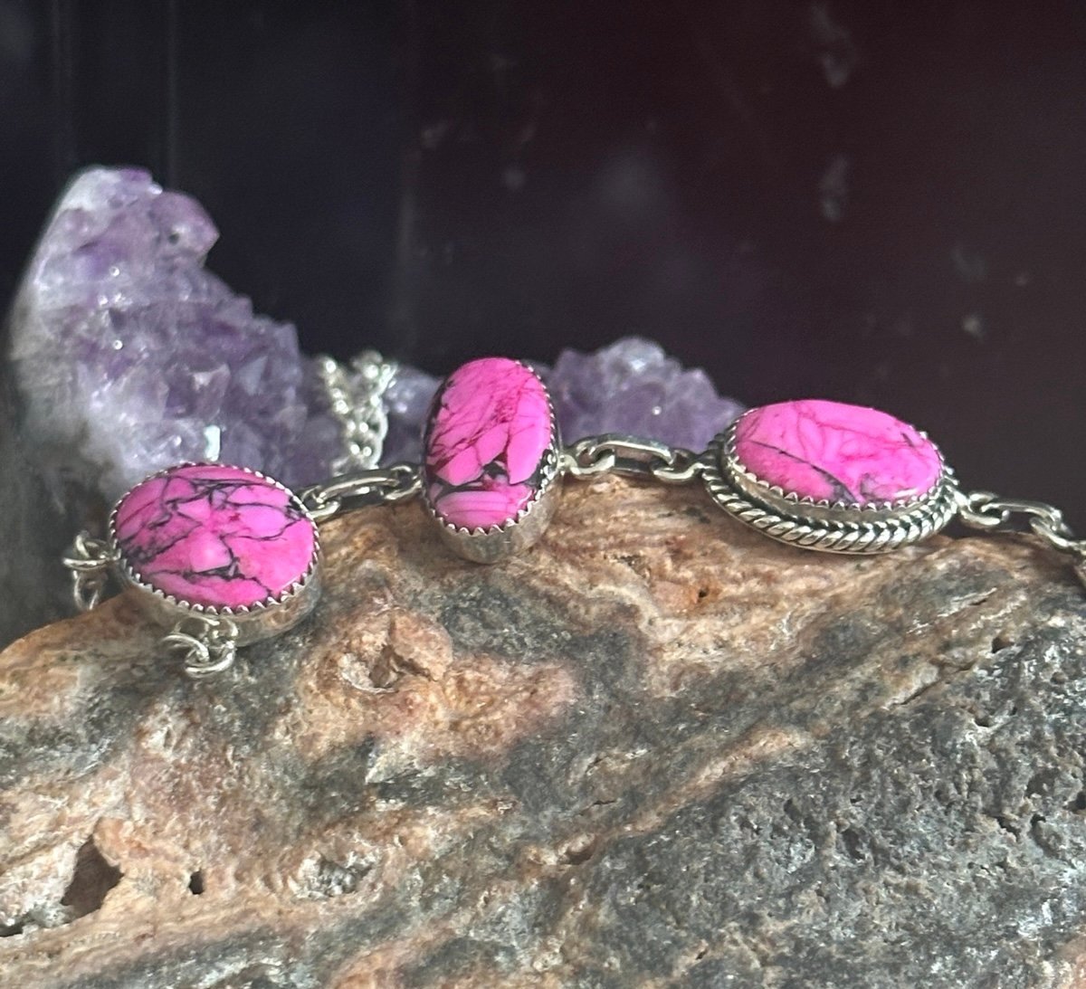 Where a balance length is approximately 18 inches with the availability to make shorter. You can wear this very high on your neck or lower, but either way you have a 3.5 inch drop on this gorgeous color pink cherry blossom Dahlia four stone necklace. Each stone is prong set to give you that tailored custom southwestern look. An extreme beauty.