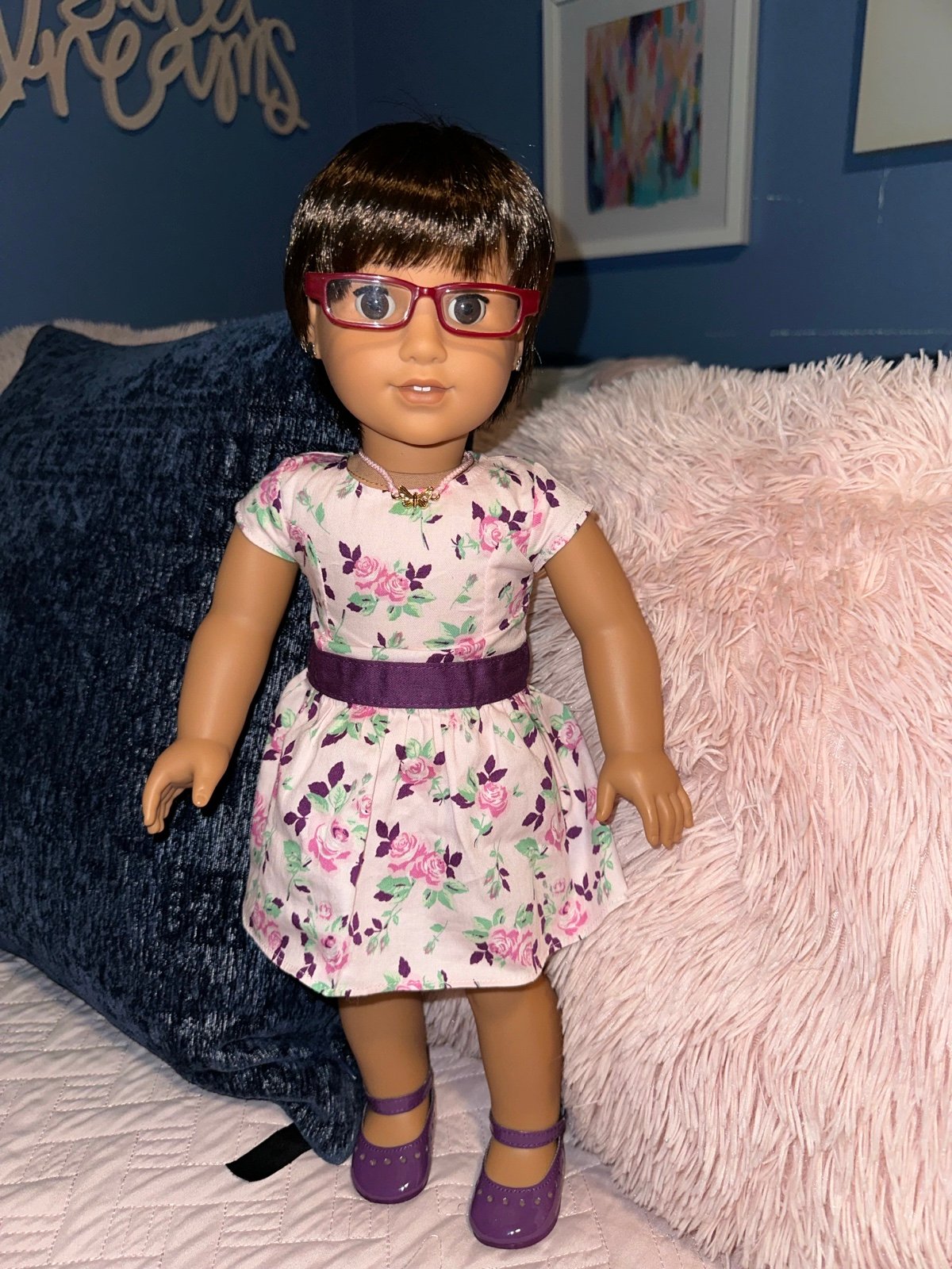 This is an authentic rare American Girl “Create Your Own” doll. She has short brown hair Pixie Cut Style, brown eyes, and medium skin tone. Comes dressed in a beautiful floral dress, denim jacket, purple shoes, and a light pink purse. Also includes cute extras — red glasses with pink case, a mini notebook and pen, and a coffee cup accessory.
