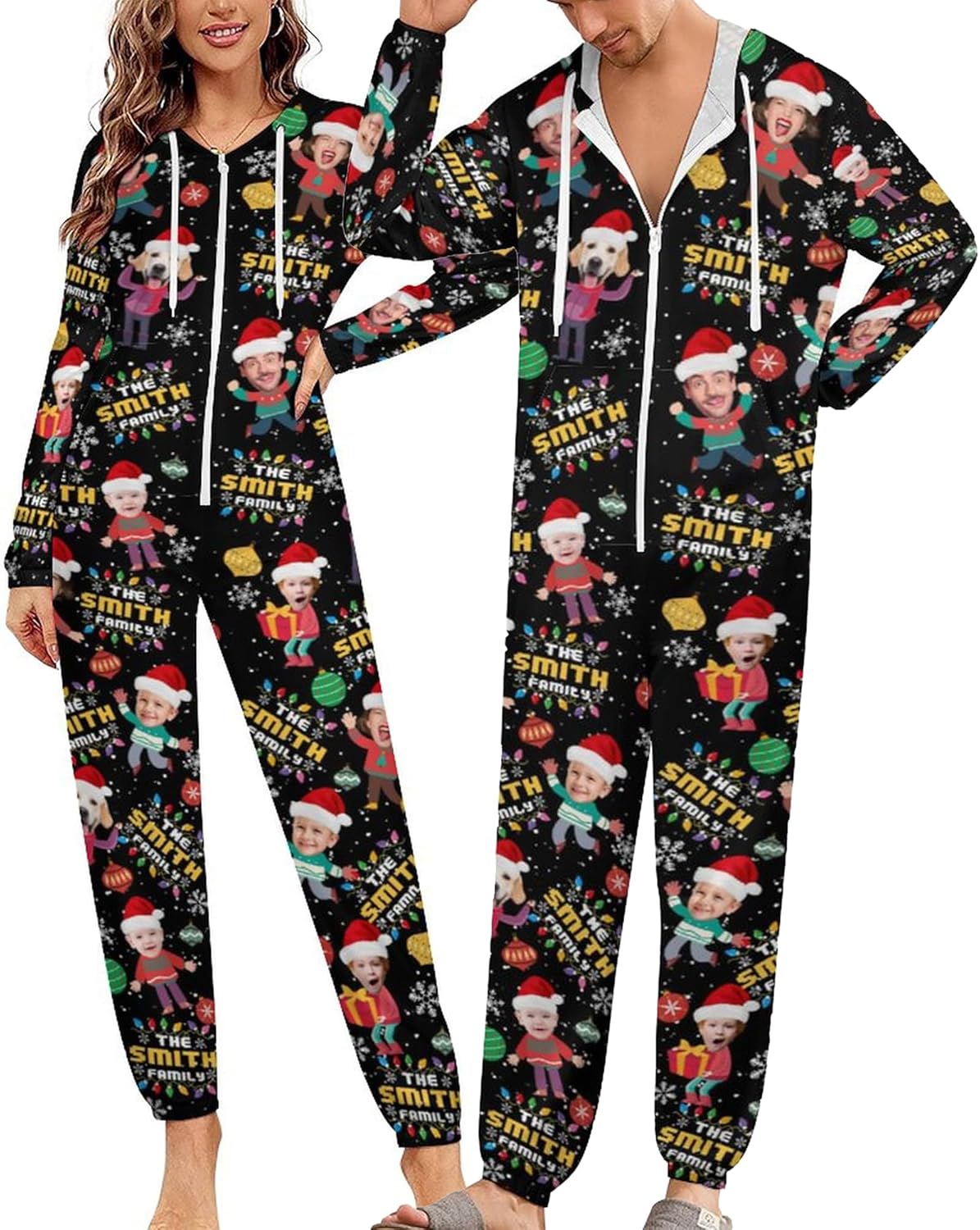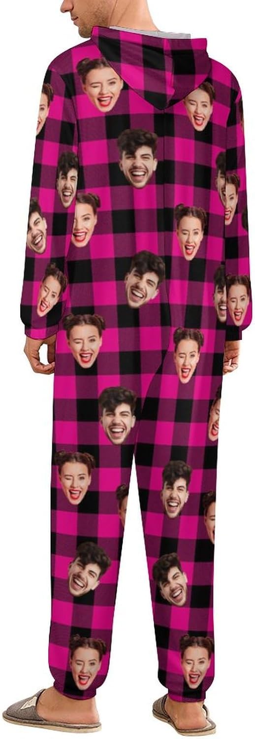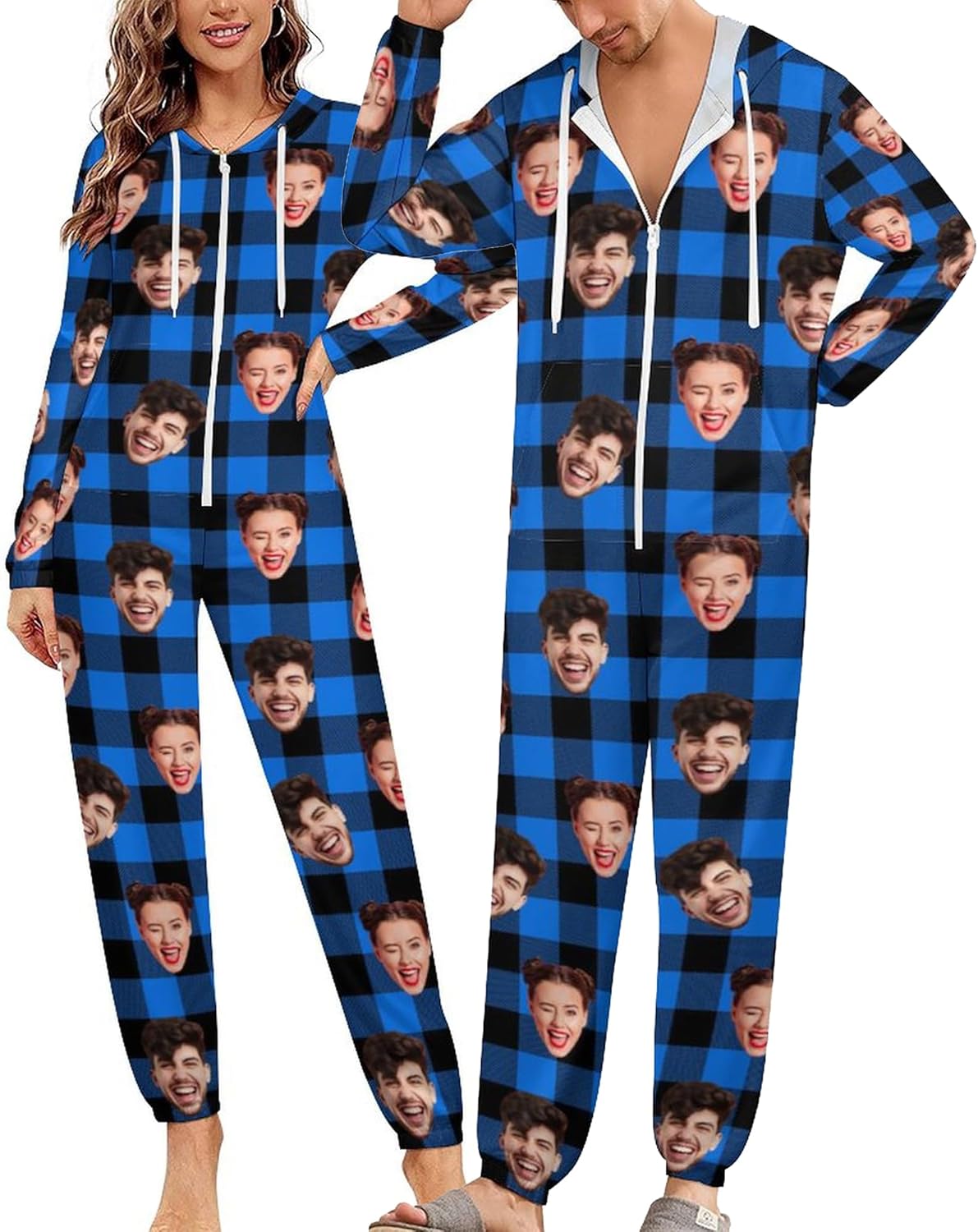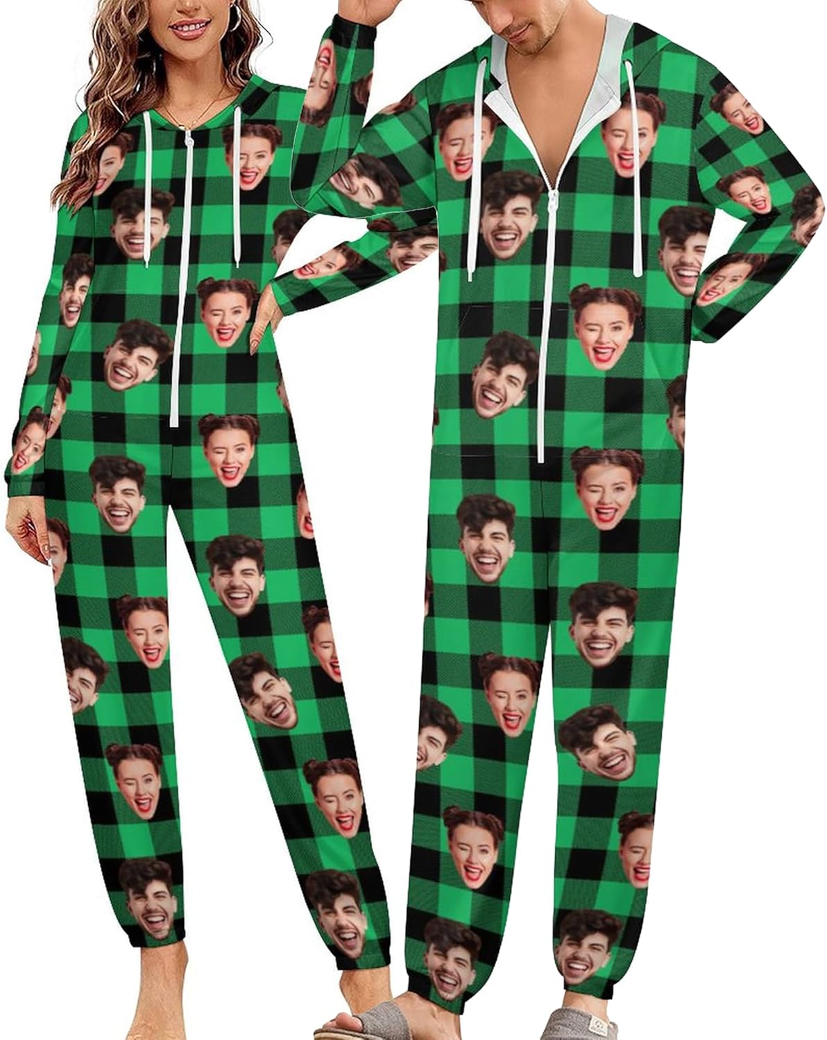 Custom Christmas Onesies for Couples Personalized Face Plaid Hoodie Matching Onesie Pajamas Funny Adult Hooded Zipper Pjs Jumpsuits with Pockets Men Women Sleepwear One Piece Loungewear Xmas Party HolidayMaterial: 95% polyester + 5% spandex; Very soft,comfortable and stretchy.Enjoy home comfort with this couple onesie pajamas. It features an versatile hood, adjustable zipper, and deep pockets, perfect for cozy nights or special occasions.Occasion: For Christmas party, holiday party, your travels, daily life, work, study, outdoor sports, vacations, specific party, spring, autumn and winter jogging, walk, couples wear, friends wear, classmate wear, etc. Wrap up the holiday spirit with couples onesie pajamas! Christmas Pajamas for Couples Notice:1. The christmas onesie pajamas is SOLD SEPARATELY, package includes one pajamas jumpsuit.Please purchase each size separately.2. The color of christmas onesie might be slightly different from the picture shown due to lighting effect or different monitor display, the quality is the same as what shown in the picture.