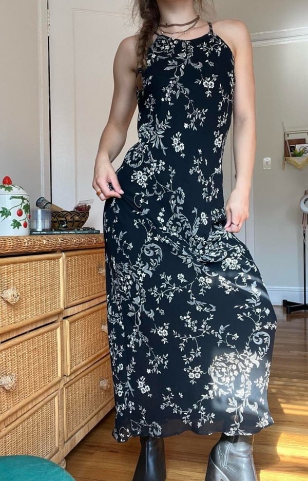 ✿ Absolutely STUNNING vintage slinky black Express dress from the 90s. Beautiful floral detailing, flowy, and DOUBLE LINED!! Super high quality and has a very flattering silhouette. In excellent condition with no flaws to note.